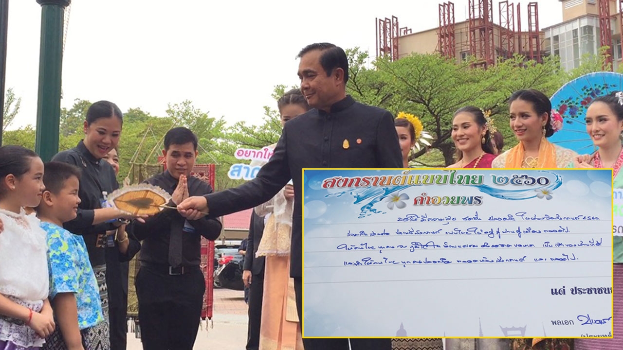 พร้อมกันนั้น นายกรัฐมนตรียังได้เขียนคำอวยพรเนื่องในวันสงกรานต์ด้วยว่า "ขอให้มีความสุข สดชื่น ปลอดภัย ในห้วงวันสงกรานต์ 2560 ร่วมกันสานต่อประเพณีสงกรานต์แบบไทย ให้อยู่คู่บ้านคู่เมืองตลอดไป ให้คนไทยทุกคนจงภูมิใจในวัฒนธรรมอันงดงามของเรา เป็นเจ้าของบ้านที่ดี และทำให้คนไทยทุกคนปลอดภัย ตลอดห้วงสงกรานต์และตลอดไป"