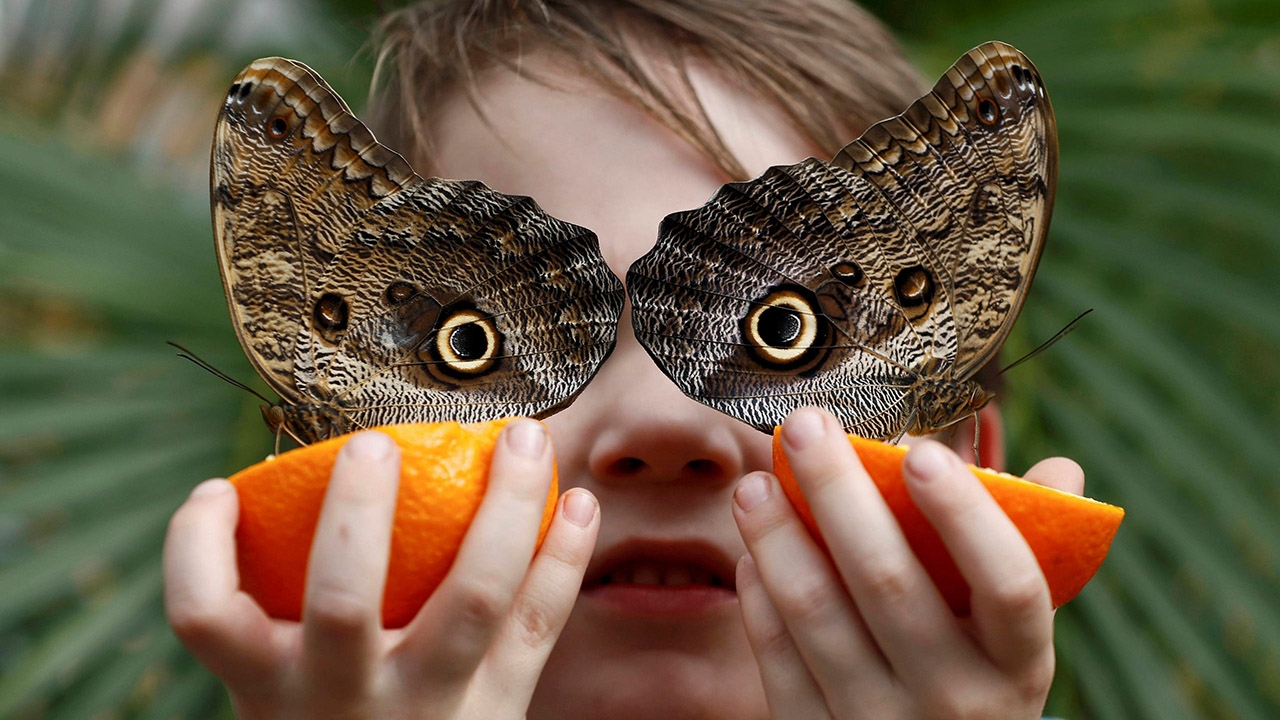 ภาพที่เกือบจะเป็นลักษณะสมมาตรของผีเสื้อนกฮูก (Owl Butterfly) มีชื่อทางวิทยาศาสตร์ว่า ไดนาสเตอร์ ดาริอุส (Dynastor Darius) หรือผีเสื้อเลียนแบบงู เนื่องจากขณะที่เป็นดักแด้มันสามารถพรางตัวเป็นเหมือนงูได้ แต่เมื่อกลายเป็นผีเสื้อก็จะมีขนาดใหญ่ ซึ่งภาพนี้เด็กชายวัย 5 ขวบกำลังชูผีเสื้อที่เกาะอยู่บนส้มครึ่งซีก ยกขึ้นมาระดับเดียวกับใบหน้า โดยลายของปีกมีวงกลมใหญ่คล้ายหน้ากากแฟนซีที่แปลกตา.