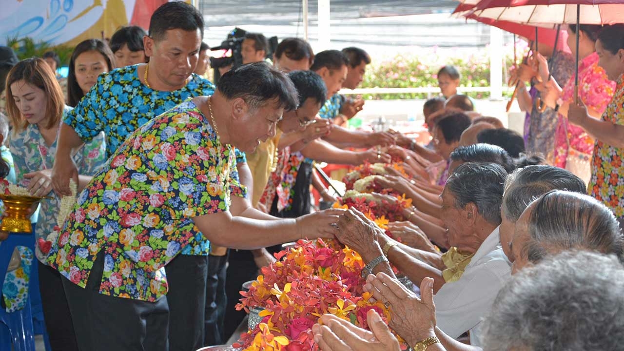 จากนั้นประชาชนร่วมสรงน้ำพระพุทธรูป สรงน้ำพระสงฆ์ ต่อจากนั้นร่วมรดน้ำขอพรจากผู้สูงอายุที่เข้าร่วมงาน เพื่อสร้างความรักและแสดงความกตัญญูกตเวทีแก่ผู้เฒ่าผู้แก่
