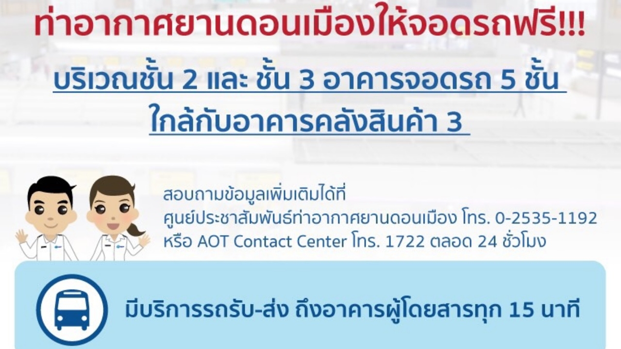 ดอนเมืองจัดบริการจุดจอดรถฟรี บริเวณชั้น 2 และ ชั้น 3 อาคารจอดรถ 5 ชั้น ใกล้กับอาคารคลังสินค้า 3 ให้กับผู้โดยสารโดยไม่คิดค่าบริการ ในช่วงวันหยุดสงกรานต์ พร้อมจัดรถเวียนรับ-ส่งมายังเทอร์มินอลตลอด 24 ชั่วโมง...