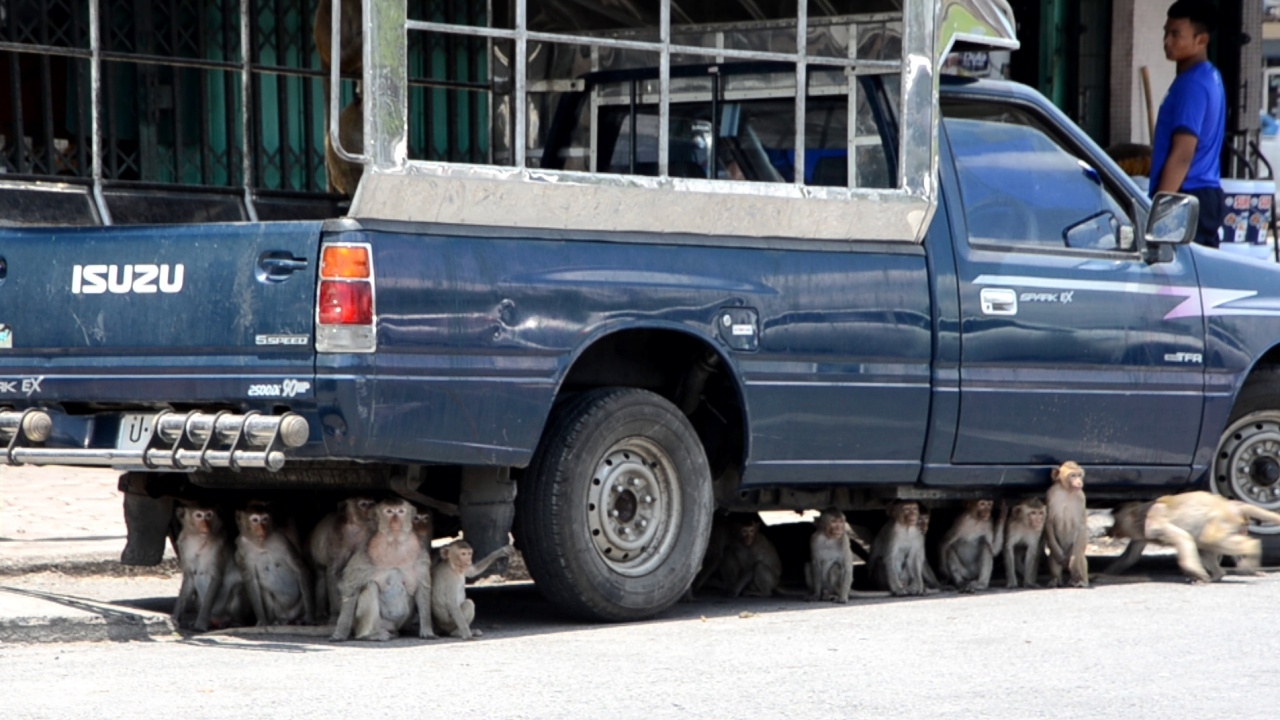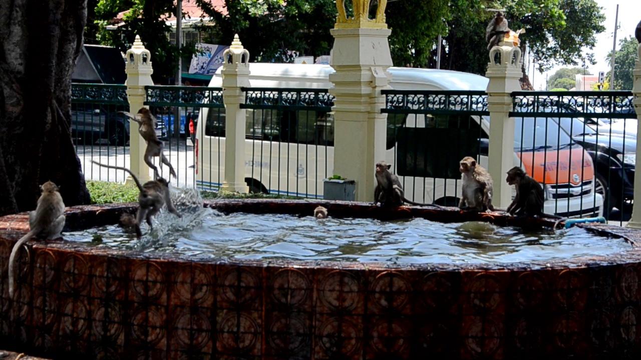 สงกรานต์ลพบุรี คนแห่กราบไหว้เจ้าพ่อศาลพระกาฬขอพร ส่วนลิงศาลพระกาฬก็เล่นน้ำในบ่อน้ำที่ทำไว้ให้คลายร้อน ขณะที่ ลิงตึก ไม่สามารถมาเล่นน้ำได้เพราะคนละถิ่น ก็ต้องอาศัยร่มเงาใต้ท้องรถกระบะ เสาไฟฟ้า ถังขยะ เป็นที่หลบแดดแทน...