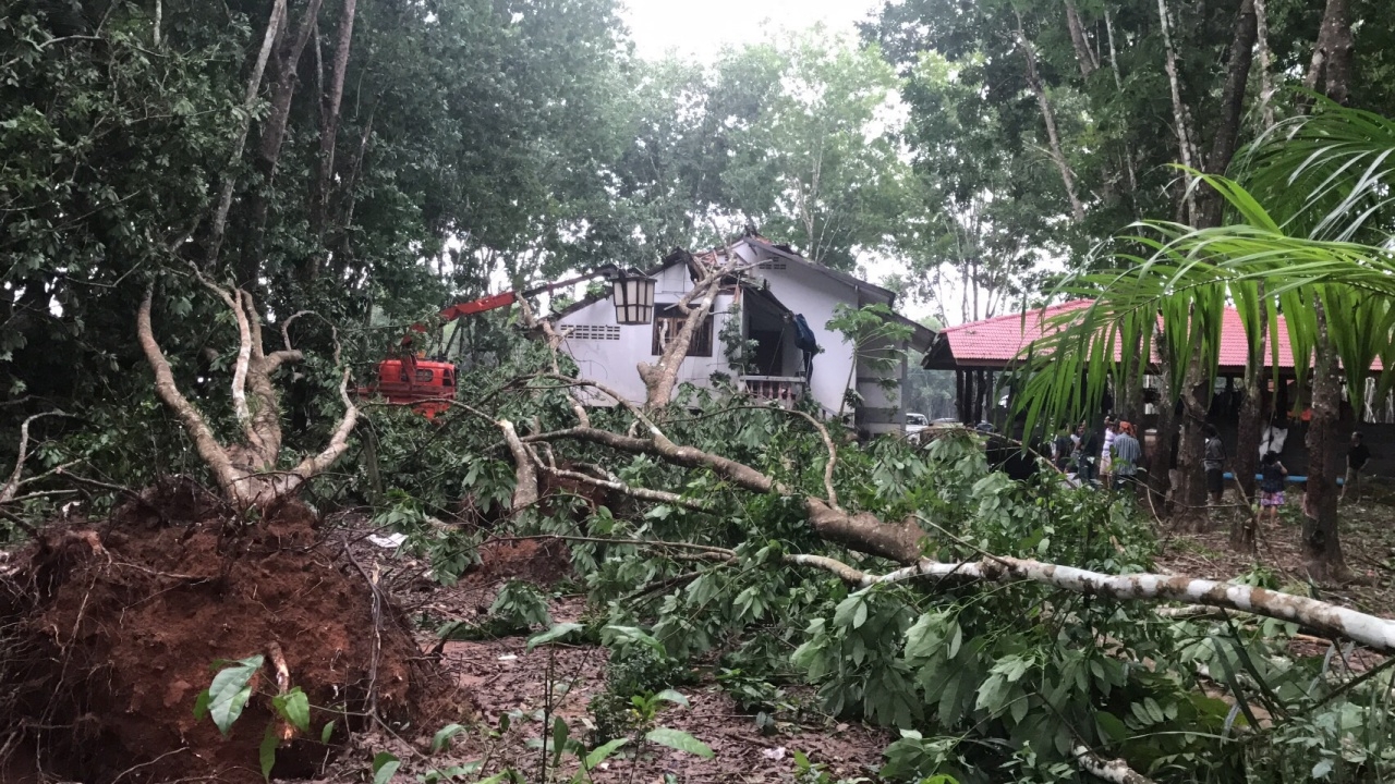 พายุฤดูร้อนถล่มสวนยาง อ.กาญจนดิษฐ์ สุราษฎร์ธานี ต้นไม้ล้มใส่หลังคาพัง เสาไฟฟ้าล้ม สายไฟขาด ชาวบ้านไม่มีไฟฟ้าใช้ จนท.นำรถกระเช้า เครื่องเลื่อยยนต์ตัดต้นยางออก เร่งซ่อมสายไฟให้ชาวบ้านใช้ตามปกติ