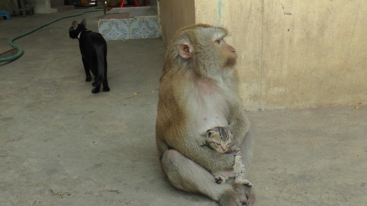 ขำกลิ้งลิงกับแมว! รักหนักมาก นางจ๋อคอยเฝ้าลูกแมวหน้ากุฏิวัดป่าใหม่ จ.ตาก เห็นปุ๊บวิ่งไปอุ้มช่วย ไซ้หาเห็บให้ด้วยความรักใคร่ เจ้าอาวาสหวั่นใจกลัวนางจ๋อทำแมวตาย เชื่อเป็นคู่บุญคู่กรรม โตมาเพิ่งเคยเห็น