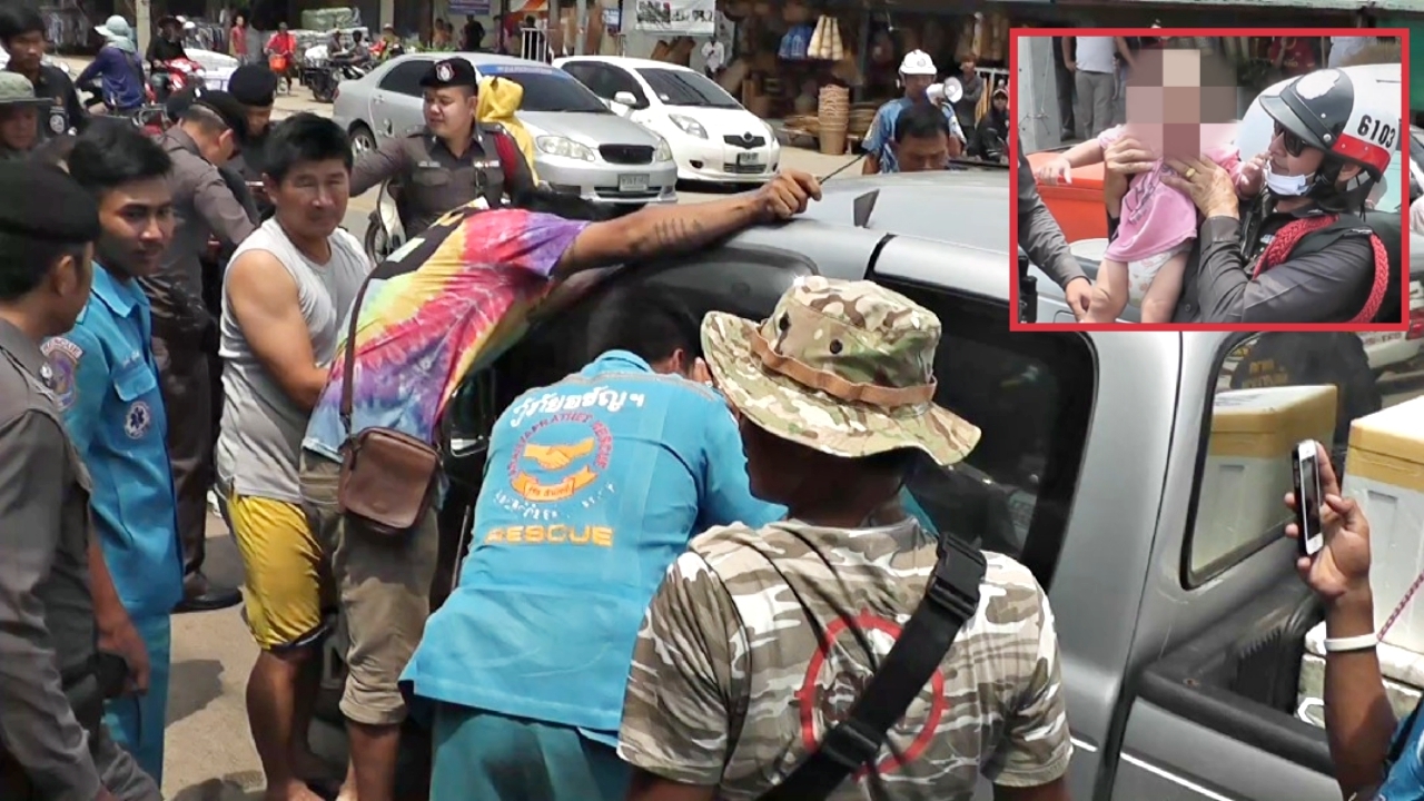 ทั้งนี้ พบรถกระบะฟอร์ด สีเทา สมาร์ทแค็บ ทะเบียน บน-899 สระแก้ว กระจกรถติดฟิล์มดำสะท้อนแสง จอดติดเครื่องอยู่หน้าร้านจำหน่ายอาหารทะเล โดยมีนายคำแพง ป้อมคำ อายุ 51 ปี เจ้าของรถยืนหน้าซีดเกาะประตูรถอยู่ และพยายามตะโกนพูดบอกลูกชายวัย 9 เดือน ซึ่งติดอยู่ในรถว่า อย่าร้องไห้