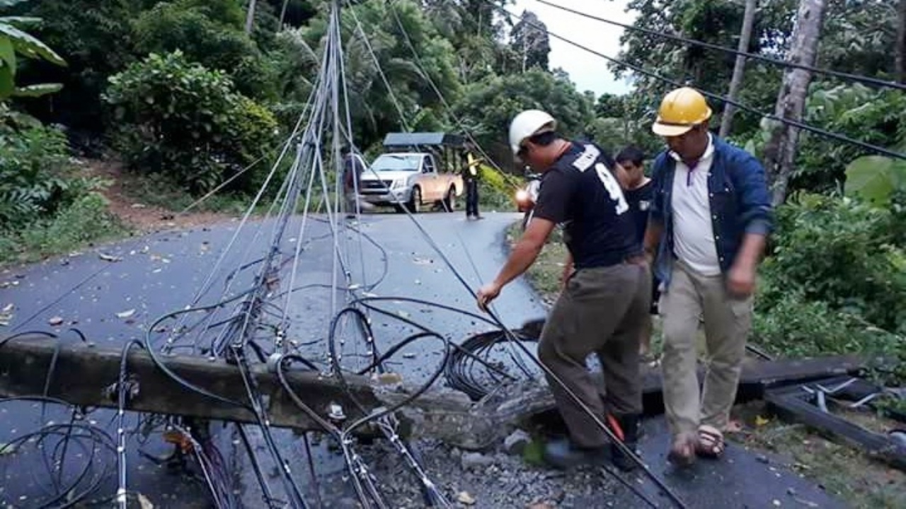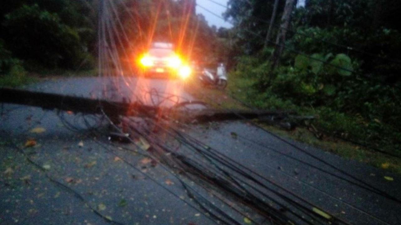 เมื่อเวลา 07.30 น. วันที่ 5 พ.ค. 60 นายกำธร เวหน นายอำเภอเกาะช้าง จ.ตราด ได้รับแจ้งจากผู้นำชุมชนว่าได้เกิดเหตุ มีต้นไม้และเสาไฟฟ้าแรงสูงล้มขวางถนนบริเวณ สายบ้านไก่แบ้-บ้านบางเบ้า ย่านโลนลี่บีช หมู่ 1 ต.เกาะช้างใต้ หลังจากได้เกิดพายุฤดูร้อนและมีฝนตกลงมาติดต่อกันนานกว่า 2 ชั่วโมงช่วงเช้ามืด เมื่อได้รับแจ้งแล้วได้ประสานไปยัง อบต.เกาะช้างใต้, ผู้นำชุมชน-อุทยาน-ตำรวจ และอาสาสมัครสมาคมกู้ภัยบุญช่วยเหลือ จ.ตราด เขต อ.เกาะช้าง พร้อมกับสั่งการให้เจ้าหน้าที่อาสารักษาดินแดน (อส.) พร้อมอุปกรณ์เลื่อยยนต์-เลื่อยมือ-มีดขอ-ขวานเดินทางไปสมทบ โดยมีเจ้าหน้าที่การไฟฟ้าส่วนภูมิภาค อ.เกาะช้าง มาทตัดกระแสไฟฟ้าก่อนจะลงมือตัดต้นไม้