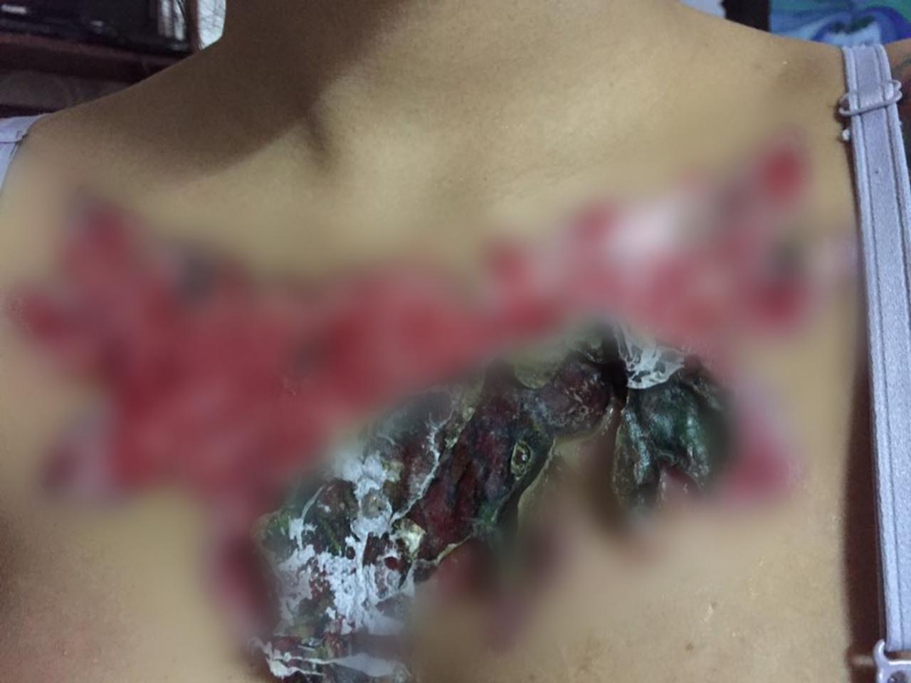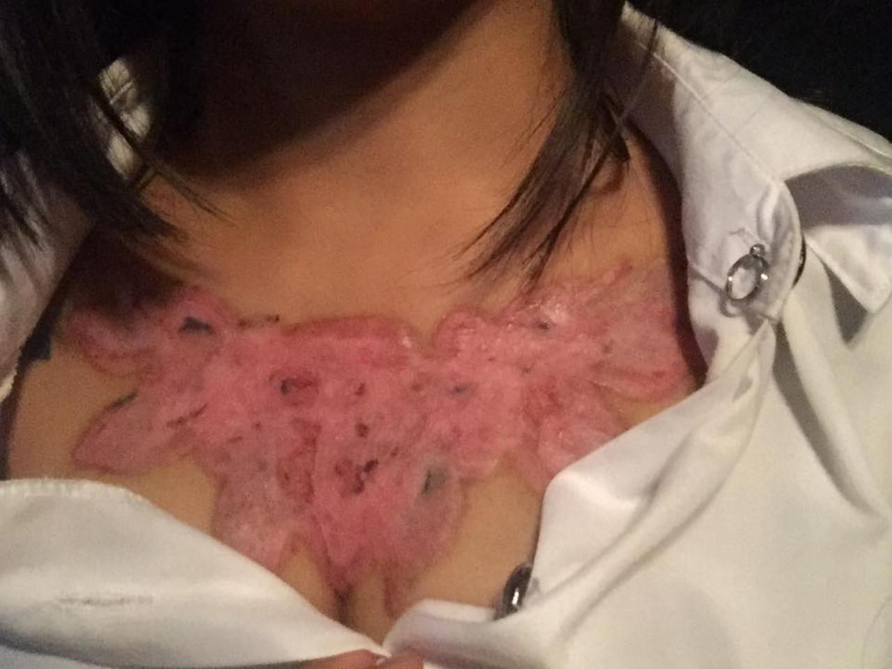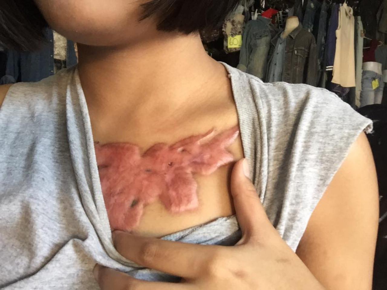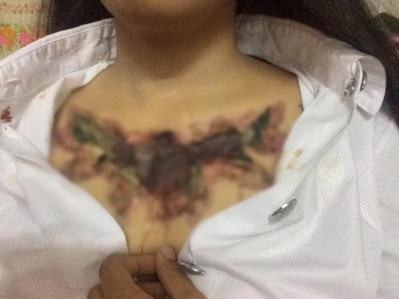 ภาพสุดสยอง! เมื่อนักศึกษาสาวภาคอีสานโพสต์รูปหลังไปลบรอยสักที่หน้าอกด้วยน้ำยาชนิดหนึ่ง จนแสบไปทั่วบริเวณ และไม่กี่วันต่อมา หนังได้ลอกออกจนเผยให้เป็นเป็นผิวหนังสีแดงพร้อมเลือดซิบๆ ต่อมาได้เกิดเป็นแผลเป็นนูนขึ้นอย่างเห็นได้ชัด ก่อนเตือนชาวเน็ตว่า “ไม่แนะนำให้ไปลบรอยสัก!”