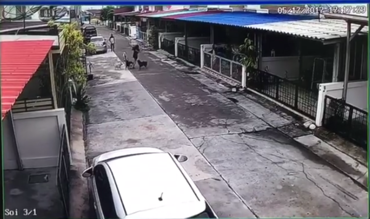 เรื่องราวเกิดขึ้นเมื่อวันที่ 12 พ.ค. ที่ผ่านมา ณ หมู่บ้านแห่งหนึ่งใน อ.บ้านบึง จ.ชลบุรี โดยตนเดินออกมาจากบ้านเพื่อจะมาทิ้งขยะ และกำลังเดินเลี้ยวกลับบ้าน จังหวะนั้นมีสุนัขอยู่ 4 ตัวที่อยู่กลางซอย ซึ่งเป็นสุนัขของบ้านข้างๆ กัน ขณะนั้นเจ้าของก็ขับรถมาจอดและเล่นอยู่กับสุนัขของเขา