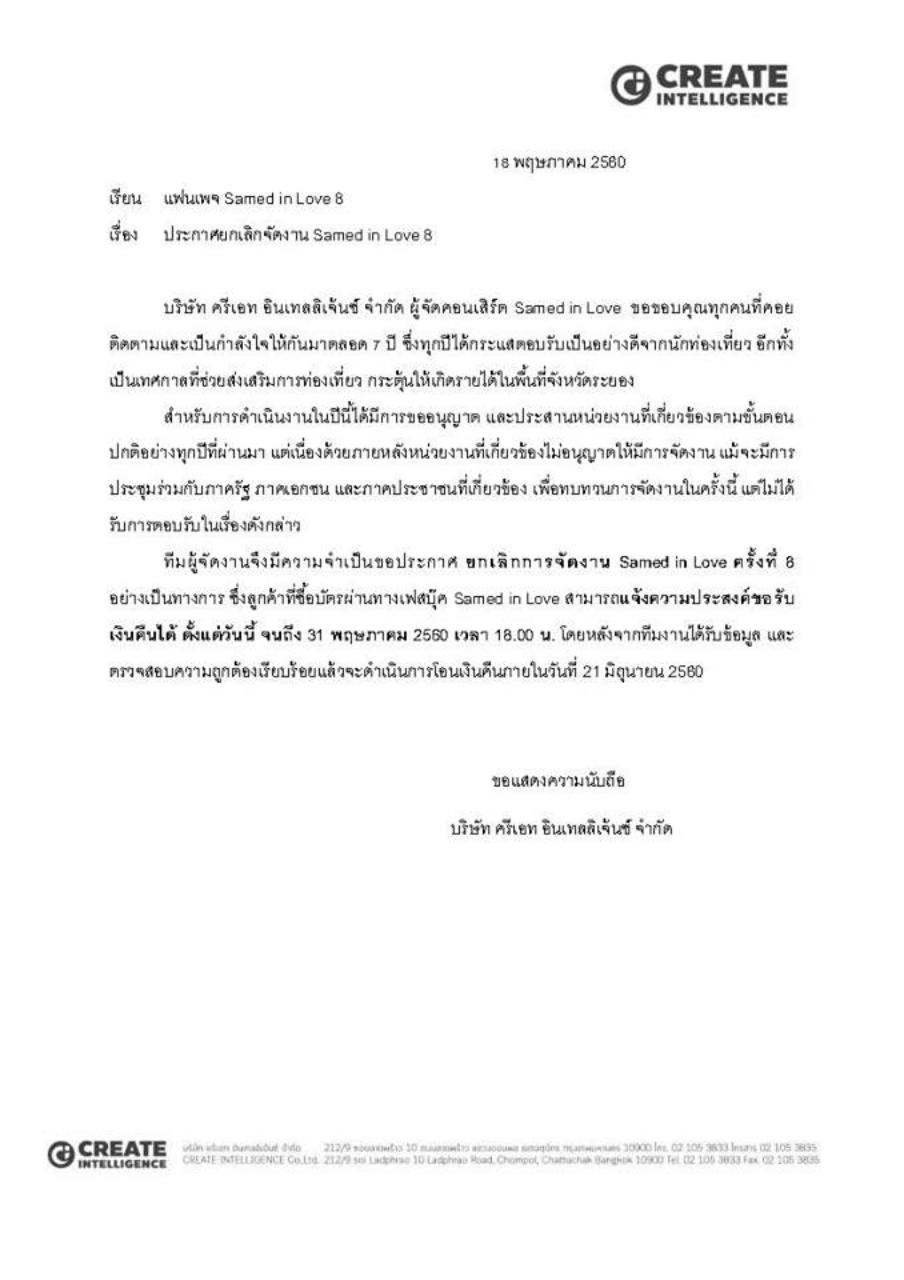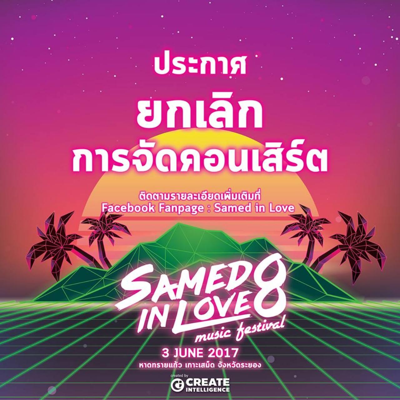 ได้แถลงข่าวยกเลิกการจัดงานเสม็ด อินเลิฟ ดังกล่าวแล้ว **