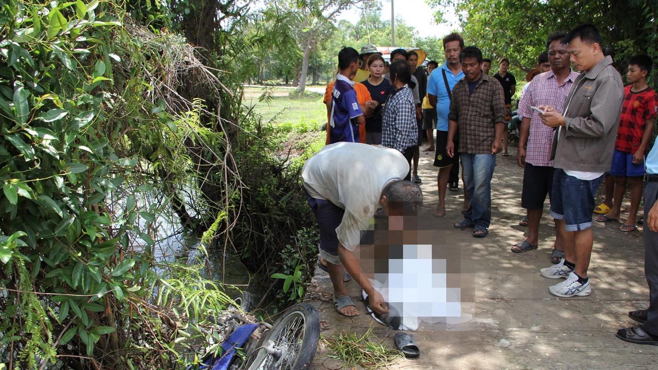 สาววัย 40 ปี เมืองศรีสะเกษ ควบจักรยานยนต์เสียหลักหลุดโค้งตีลังกาชนตอไม้ คนขี่ลอยตกสระน้ำจมเสียชีวิต
