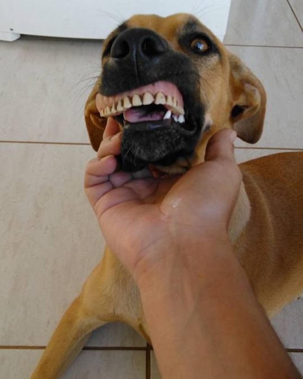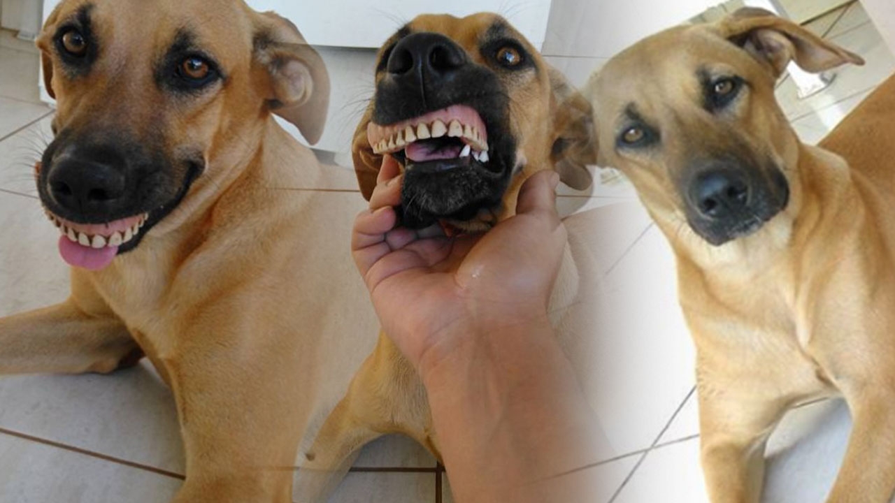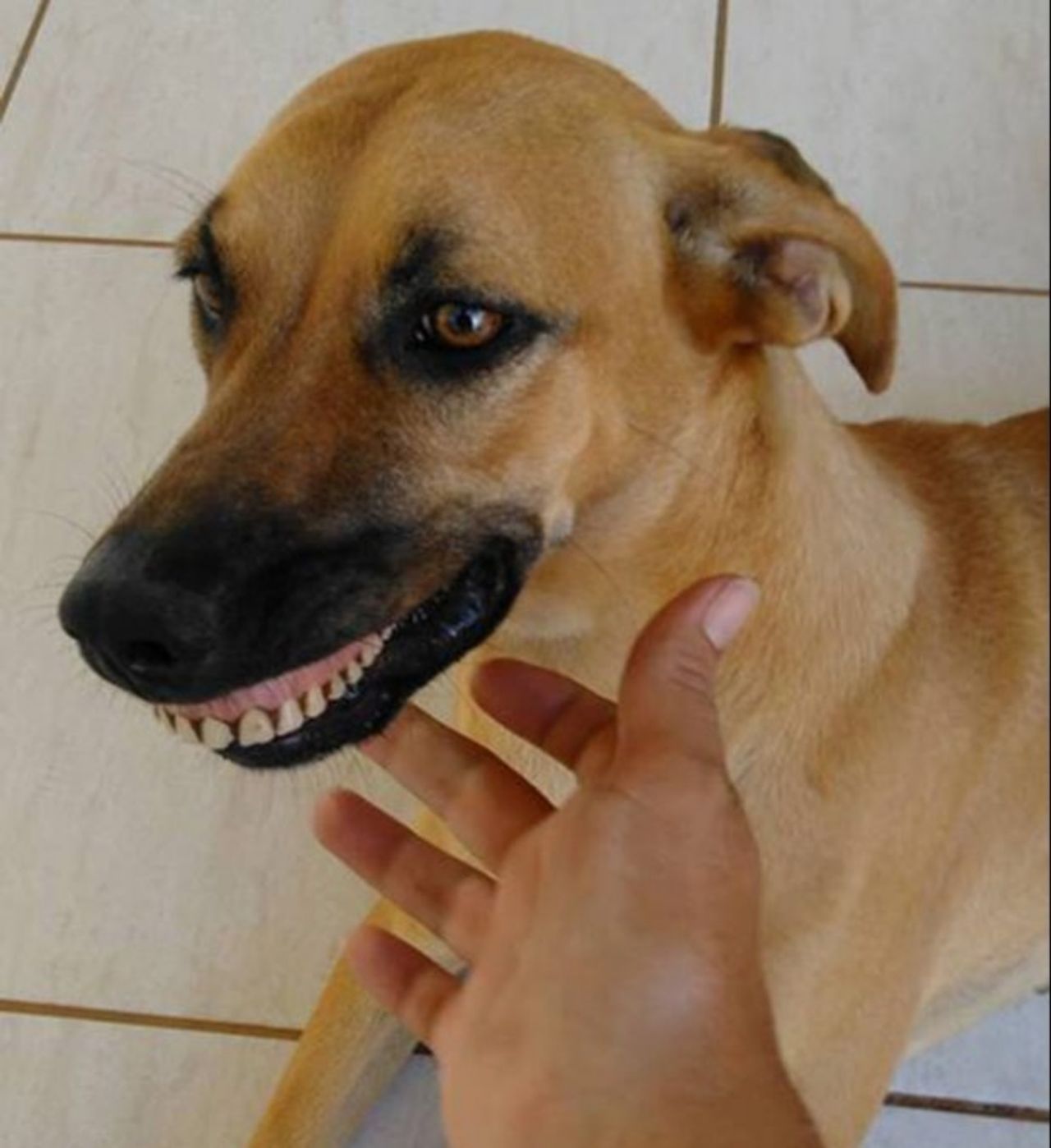 ภาพที่เห็นนั่นคือ เจ้าตูบตัวแสบกำลังยิ้มแฉ่ง เพราะมีฟันปลอมที่มันขุดเจอจากสวนติดอยู่ในปากด้วย