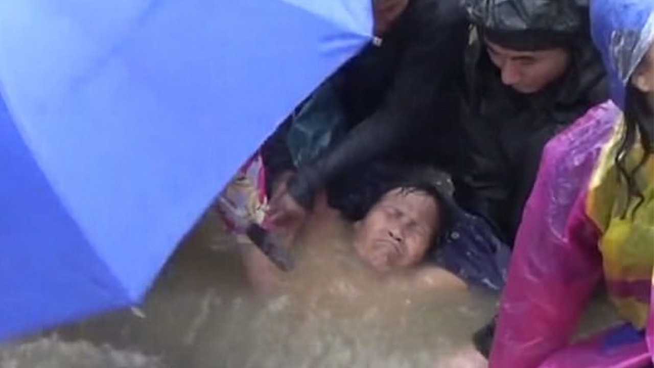 โดยในคลิปดังกล่าว แสดงให้เห็นภาพหญิงชราลงไปติดกับร่องระบายน้ำ จนร่างใกล้จะจมน้ำซึ่งกำลังเพิ่มระดับขึ้นเรื่อยๆ อยู่รอมร่อ ท่ามกลางฝนที่ยังตกลงมาอย่างหนัก โดยมีบรรดาพลเมืองดีและเจ้าหน้าที่กู้ภัยพยายามเข้าไปให้การช่วยเหลือ โดยการยกศีรษะของเธอให้อยู่เหนือระดับน้ำตลอดเวลา รวมทั้งใช้เครื่องมือต่างๆ เพื่อหาทางเอาร่างเธอขึ้นมาจากร่องน้ำดังกล่าวให้ได้ ซึ่งในที่สุดก็ประสบความสำเร็จ หลังจากนั้น หญิงชราเคราะห์ร้ายก็ได้ถูกนำตัวส่ง รพ. ล่าสุดมีรายงานว่าอาการปลอดภัยแล้ว.