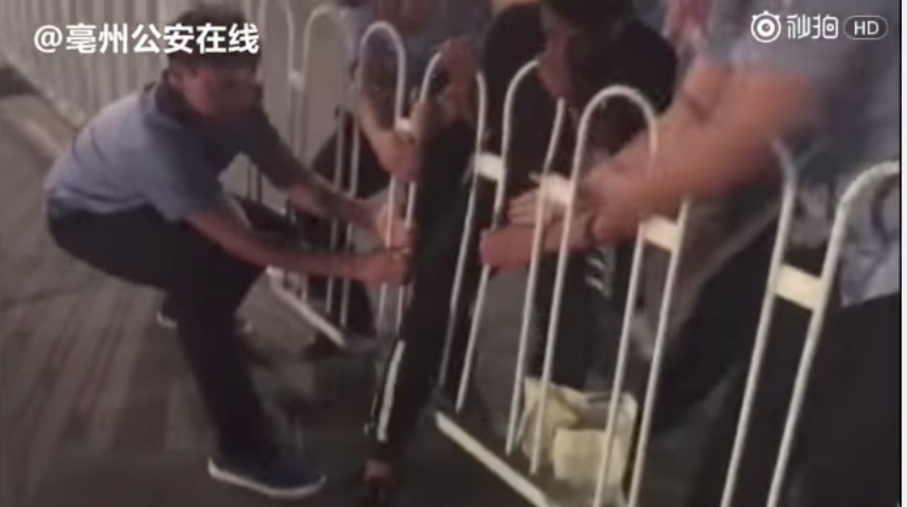 แต่แล้ว ทุกสิ่งทุกอย่างที่คิดไว้ก็ผิดถนัด เพราะตัวดันไปติดค้างอยู่ระหว่างกลางรั้วกั้นถนนเป็นเวลานาน แม้จะพยายามแค่ไหนก็ไม่สามารถรอดไปได้ จนในที่สุดเจ้าหน้าที่ตำรวจ เมืองปอโจว มณฑลอันฮุย ต้องเดือดร้อนเข้ามาให้ความช่วยเหลือหนุ่มมักง่ายรายนี้ กระทั่งเอาร่างหลุดรอดจากรั้วไปได้ในที่สุด