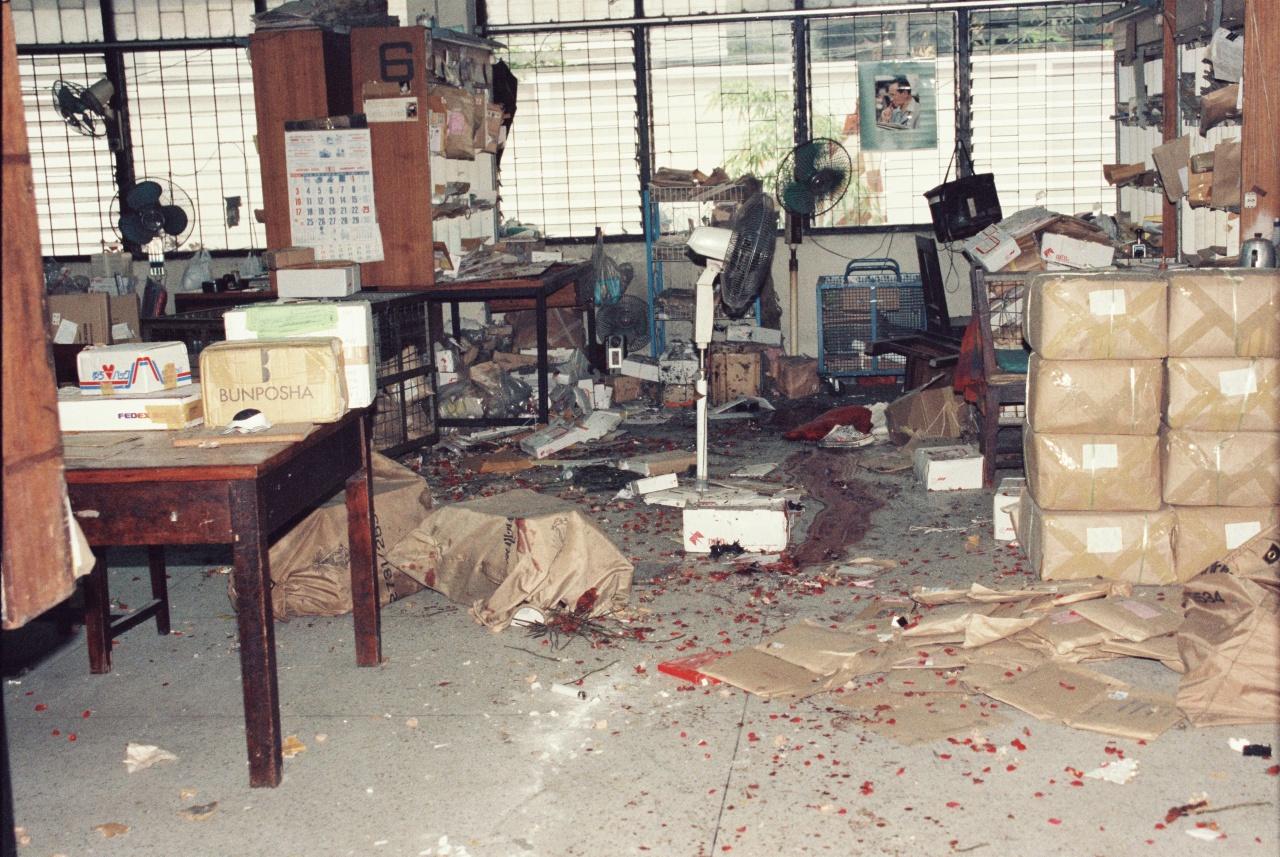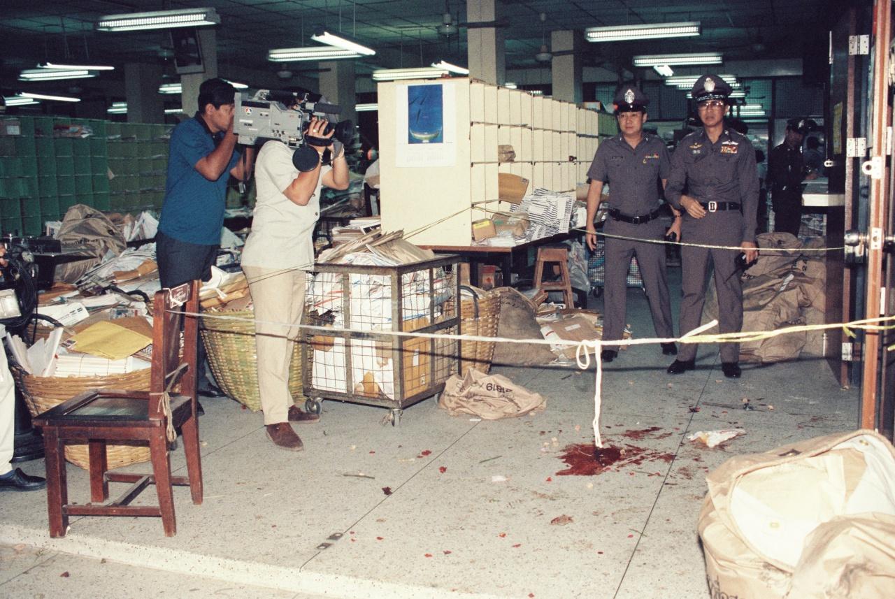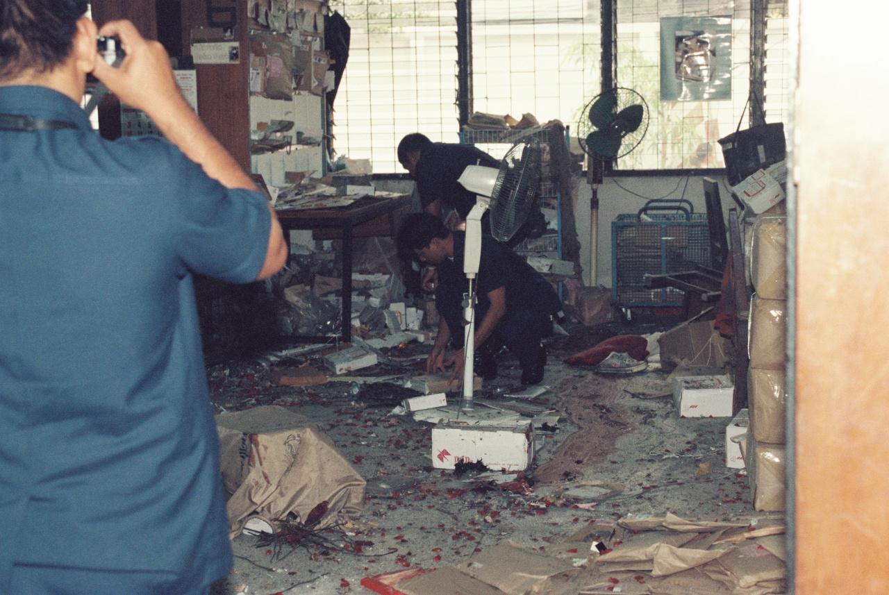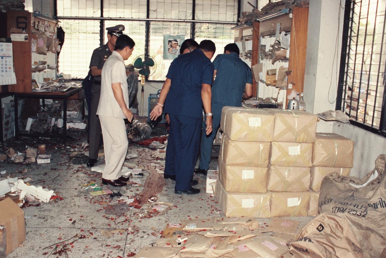 เมื่อไปถึงที่เกิดเหตุ บริเวณห้องเก็บพัสดุด้านหลังของที่ทำการ ซึ่งเป็นอาคารชั้นเดียว ข้าวของโต๊ะตู้ล้มระเนระนาด เศษเนื้อ อวัยวะ กระจายไปทั่ว กองเลือดสาดกระเซ็นตามผนังและเพดาน ห่างจากประตูทางเข้าด้านหลัง 15 เมตร เคาน์เตอร์วางของแตก ห่อพัสดุรับร้อยห่อได้รับความเสียหาย และมีเศษดอกกุหลายปะปนอยู่กับซากปรักหักพัง