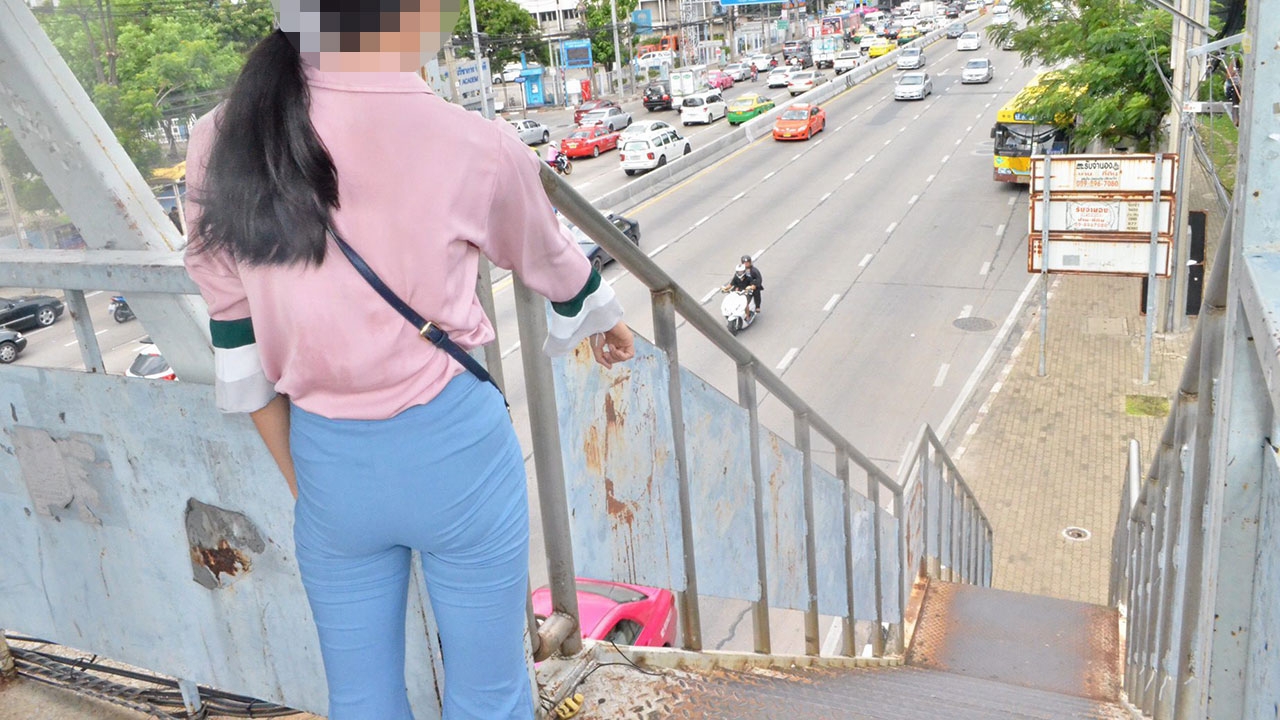 หญิงผู้เสียหายถูกคน ร้ายลวนลามบนสะพานลอยหน้าบริษัททีโอที สาขางามวงศ์วาน ชี้จุดที่เดินสวนกับคนร้ายก่อนเกิดเหตุ ผู้เสียหายรายนี้ระบุด้วยว่าคนร้ายน่าจะเป็น รายเดียวกับที่ก่อเหตุบนสะพานลอยหน้า นสพ.เดลินิวส์.