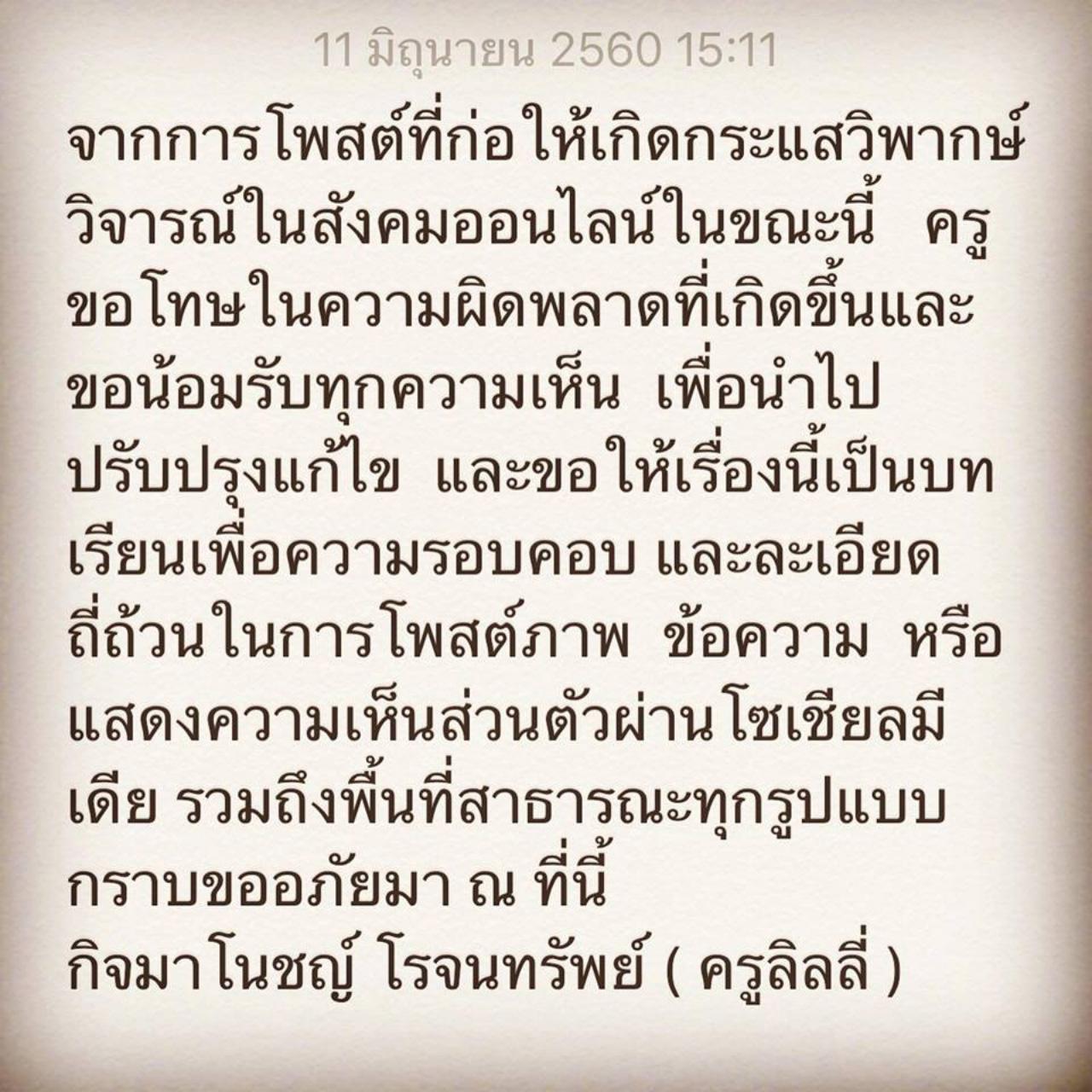 จากการโพสต์ที่ก่อให้เกิดกระแสวิพากษ์วิจารณ์ในสังคมออนไลน์ในขณะนี้ ครูขอโทษในความผิดพลาดที่เกิดขึ้น และขอน้อมรับทุกความเห็นเพื่อนำไปปรับปรุงแก้ไข และขอให้เรื่องนี้เป็นบทเรียนเพื่อความรอบคอบ และละเอียดถี่ถ้วนในการโพสต์ภาพ ข้อความ หรือแสดงความเห็นส่วนตัวผ่านโซเชียลมีเดีย รวมถึงพื้นที่สาธารณะทุกรูปแบบ