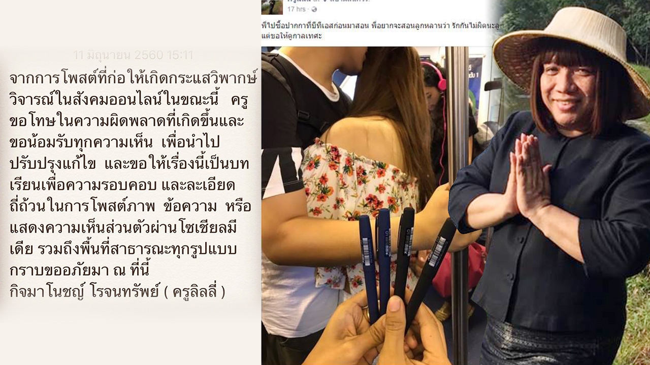 จากกรณีกระแสดราม่า ครูลิลลี่ หรือ กิจมาโนชญ์ โรจนทรัพย์ อาจารย์สอนวิชาาภาษาไทยชื่อดัง ได้โพสต์เฟซบุ๊กส่วนตัว ว่า “พี่ไปซื้อปากกาที่บีทีเอสก่อนมาสอน พี่อยากจะสอนลูกหลานว่า รักกันไม่ผิดนะลูก แต่ขอให้ดูกาลเทศะ” ซึ่งเป็นรูปชายหญิงคล้ายกอดกันบนรถไฟฟ้า BTS ซึ่งต่อมา มีผู้แสดงความคิดเห็นจำนวนมาก โดยเฉพาะเรื่องการเคารพสิทธิ์ของผู้อื่น และอาจจผิด พ.ร.บ.คอมพิวเตอร์ นั้น