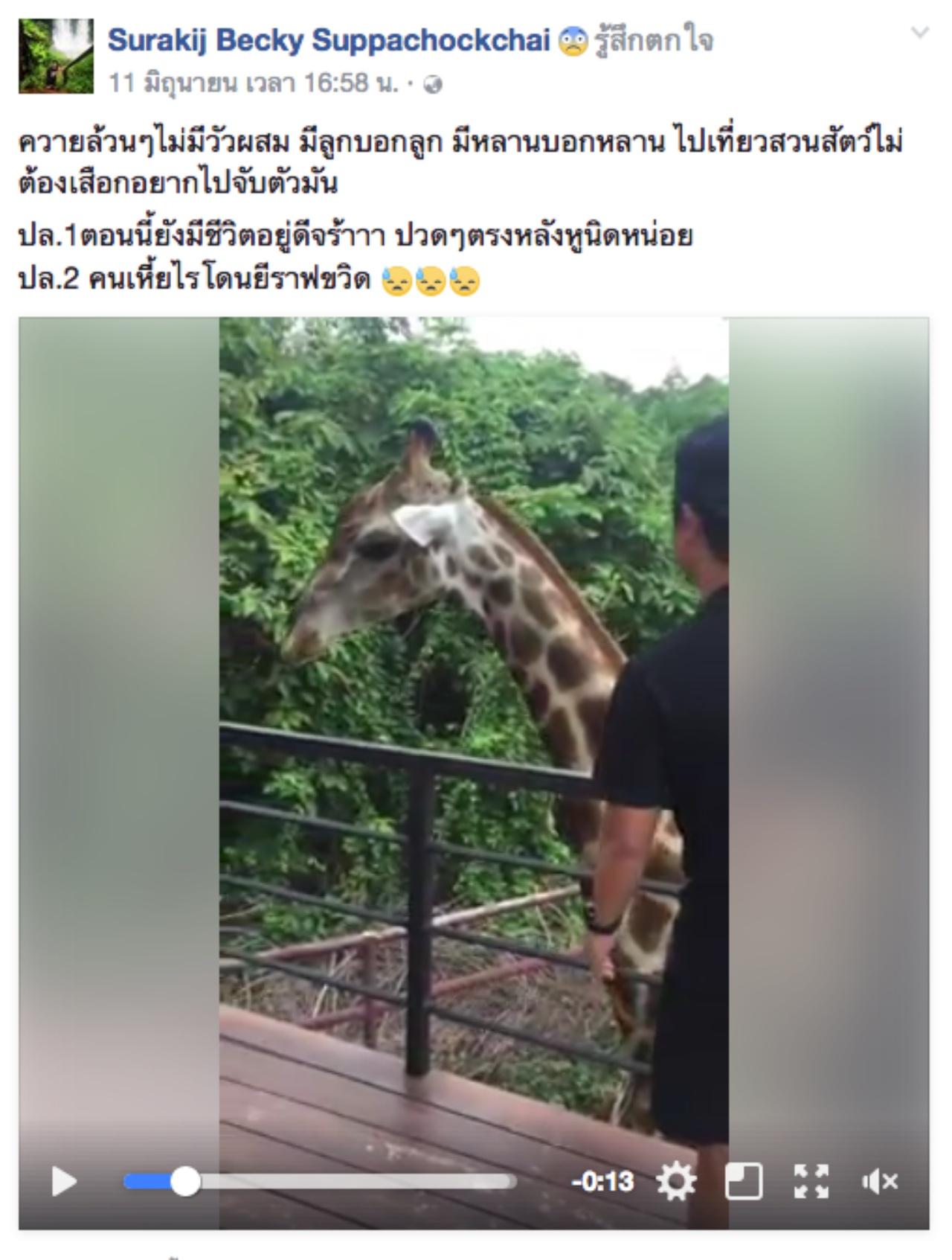 ผู้สื่อข่าวรายงานว่า ขณะนี้โลกโซเชียลเน็ตเวิร์ก ได้มีการแชร์คลิปหนุ่มคนหนึ่งชื่อ Surakij Becky Suppachockchai ซึ่งเป็นคลิปที่กำลังจะไปจับหัวยีราฟ ในสวนสัตว์แห่งหนึ่ง ใน จ.ขอนแก่น ปรากฏว่า แต่แล้วจู่ๆ ยีราฟ ตัวดังกล่าว ได้ใช้เขาขวิดหนุ่มคนดังกล่าว จนต้องกระโดดตัวหลบ