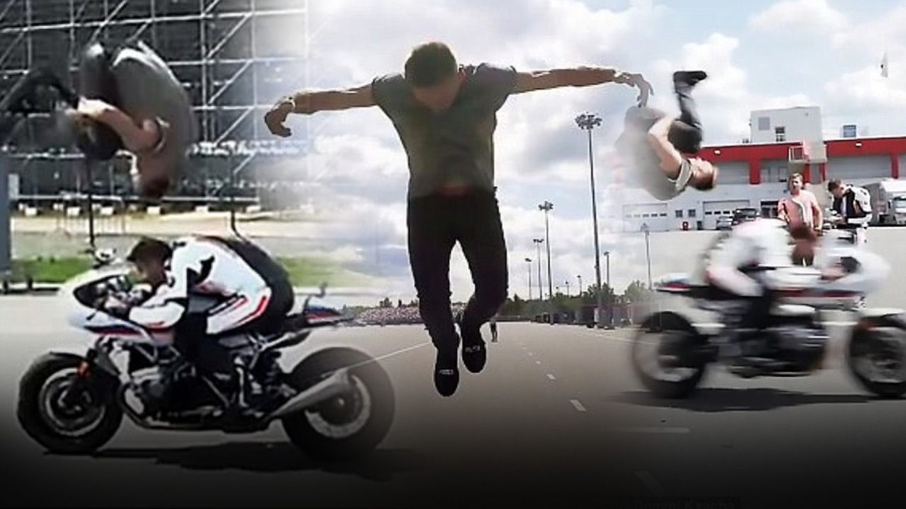 ว่าแล้ว พ่อหนุ่ม Olel Shestyarenko ก็โชว์การกระโดดตีลังกากลางอากาศ ข้ามหัวคนขับขี่รถจักรยานยนต์ซุปเปอร์ไบค์ ที่กำลังขับพุ่งเข้ามาใส่ร่างเค้าด้วยความเร็ว จนประสบความสำเร็จในที่สุด