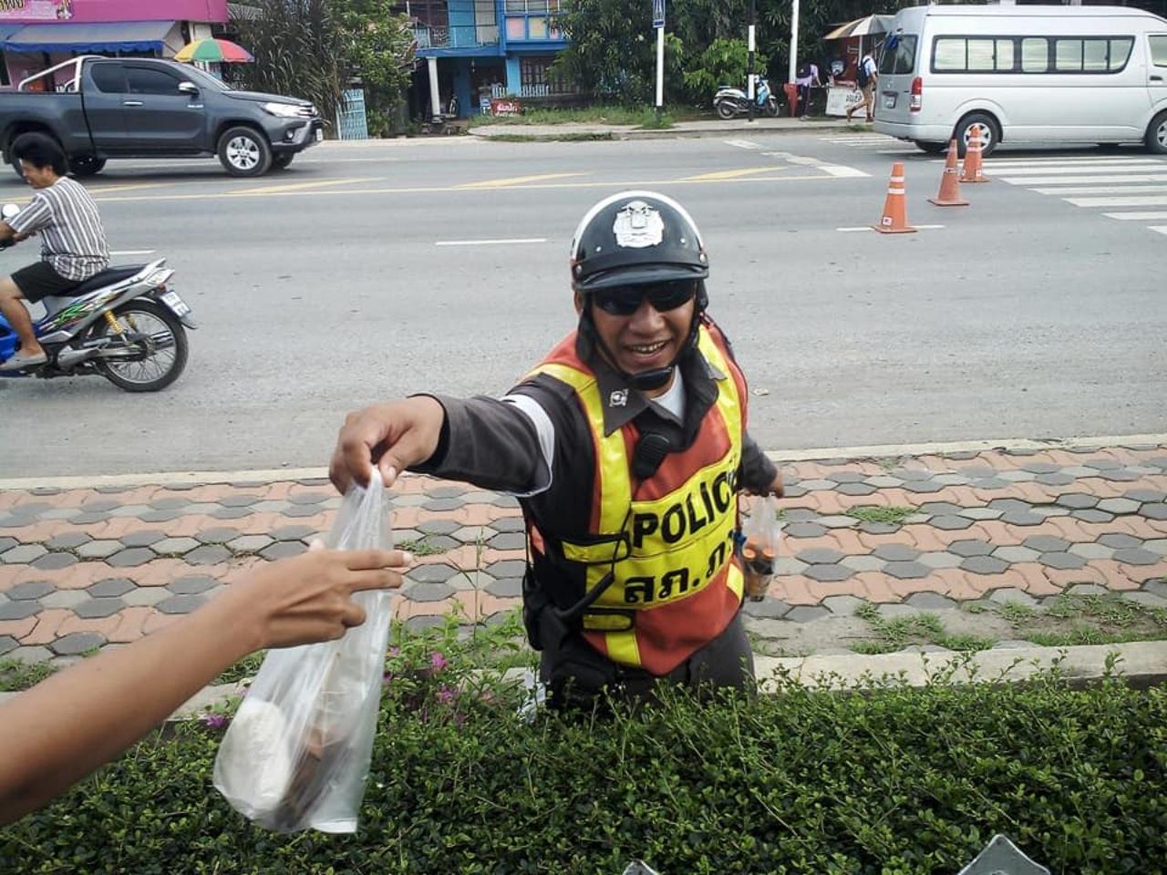 ไทยรัฐออนไลน์ ได้โทรศัพท์ไปสอบถามเจ้าตัว ด.ต.กฤษณ์ บูรณ์เจริญ สภ.ภาชี จ.พระนครศรีอยุธยา โดย ด.ต.กฤษณ์ เล่าให้ผู้สื่อข่าวฟังว่า เหตุการณ์ดังกล่าวเกิดขึ้นมาตั้งแต่สัปดาห์ที่แล้ว และเช้าวันนั้นตนไปทำหน้าที่โบกรถอยู่หน้าโรงเรียนภาชีสุนทรวิทยานุกูลตามปกติ ซึ่งขณะนั้นเป็นเวลาเรียกเข้าแถว ยังมีเด็กนักเรียนที่ยังไม่ได้กินข้าวเช้ากำลังจะข้ามถนนไปซื้อหมูปิ้งที่อยู่ฝั่งตรงข้าม และเห็นตนเดินมาพอดีจึงฝากตนซื้อข้าวเหนียวหมูปิ้งให้ ซึ่งตนก็วิ่งไปซื้อมาให้ไม่ได้คิดอะไร เป็นเรื่องเล็กๆ น้อยๆ ช่วยเหลือกันได้ก็ช่วยกันไป