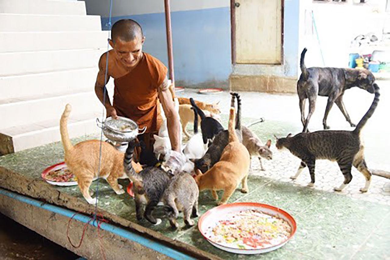 “โดยปกติ อาตมาจะบอกโยมเขาไปว่า อาตมาไม่อยากรับปัจจัย เพราะอาจทำให้คนเข้าใจผิดว่า อาตมาจะเอาเงินเขาไปทำหรือไปใช้อย่างอื่นหรือเปล่า อาตมาก็เลยตัดปัญหาด้วยการแนะนำให้ญาติโยมบริจาคมาเป็นอาหารแทน แต่ถ้าไม่มีอาหารบริจาคจากญาติโยม อาตมาก็จะใช้งบประมาณตัวเองที่ได้มาจากกิจนิมนต์ มาซื้อปลาซื้อไก่ให้หมาแมวได้กิน ซึ่งตกวันละร้อยกว่าบาทเท่านั้น ถ้ามีลูกแมว อาตมาก็จะซื้อนมยกแพ็กให้เอาไว้ให้ด้วย” พระนิรันทร์ กล่าว