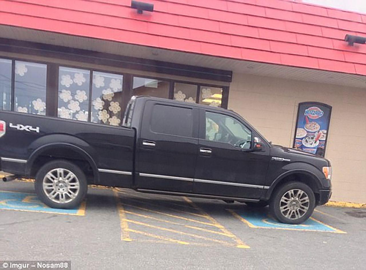 ไม่เพียงจอดทับจุดจอดรถคนพิการ ยังจอดขวางทางเข้าร้านอีก (อเมริกา)