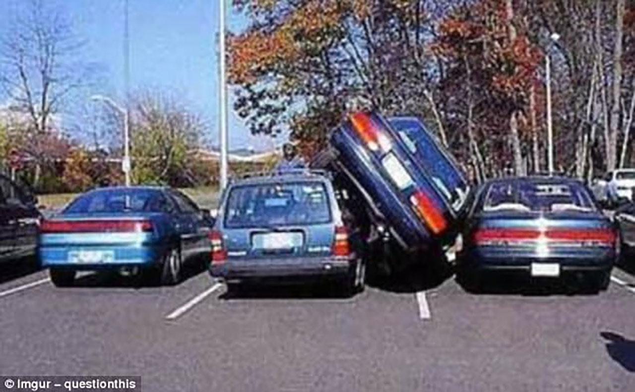 สถานการณ์นี้ไม่เคยเห็น สงสัยรถยนต์คงถูกทิ้งลงมาจากสวรรค์ หรือไม่ก็ขับตะแคงเพื่อจอดทับ ช่างกล้าจริงๆ