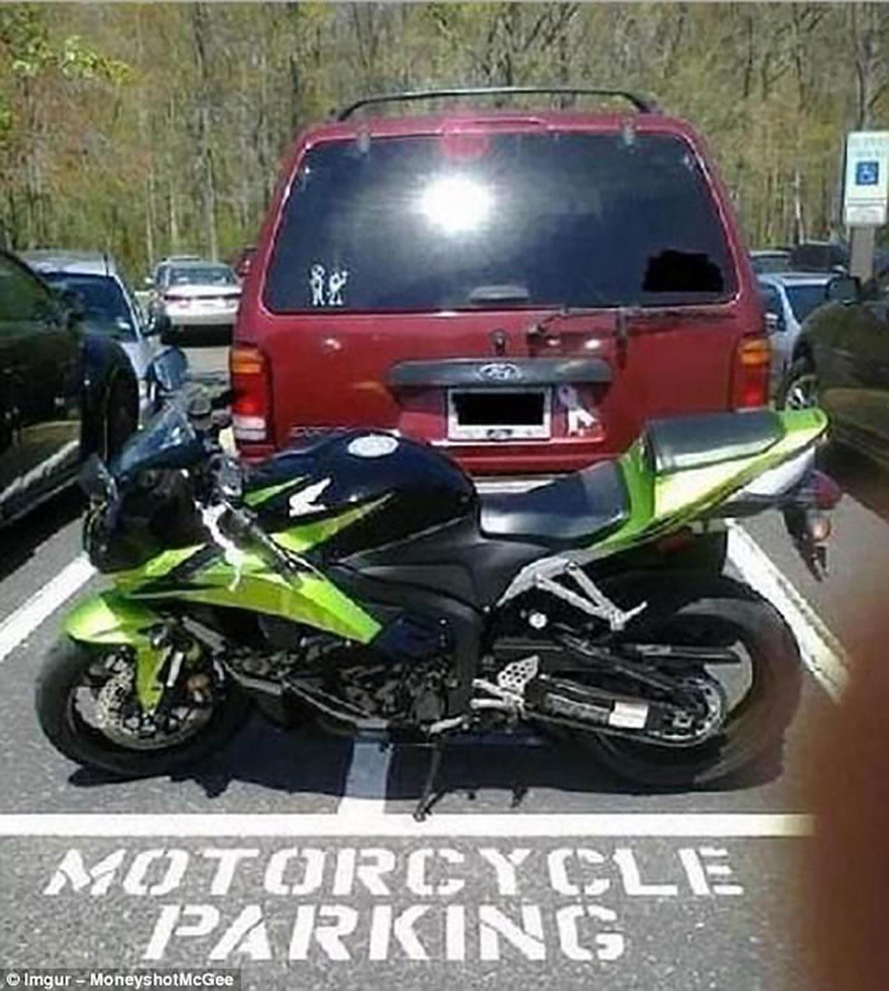จอดในที่สำหรับจอดมอเตอร์ไซค์ ถูกดัดนิสัยโดยถูกปิดท้ายรถเพื่อไม่ให้ขับออกได้