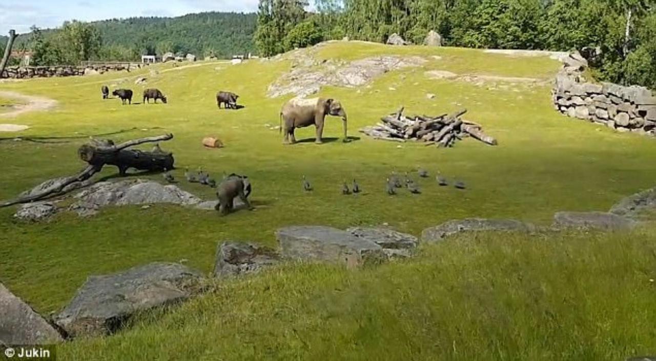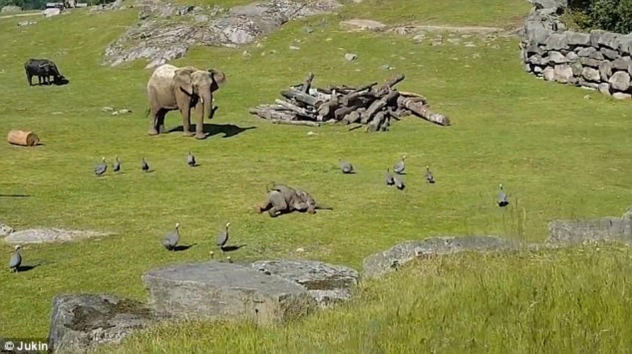 โดยคลิปวินาทีขายหน้าปนน่าขันของเจ้าลูกช้างจอมซนนี้ เป็นภาพขณะที่ช้างน้อยกำลังทำห้าว วิ่งเป็นวงกลมไล่ฝูงนกกินี ที่กำลังลงมาเดินบนพื้นหญ้าอย่างเมามัน แต่แล้วจู่ๆ เจ้ายักษ์น้อยก็เกิดพลาดท่า เซถลาล้มกลิ้งไม่เป็นท่าลงไปวัดความยาวของพื้นหญ้าในบริเวณนั้นแทน เมื่อเกิดเหตุเช่นนี้ขึ้น แม่พลายที่ยืนอยู่ใกล้ๆ จะเดินเข้าไปดูลูกน้อย เพื่อเช็กดูว่าหลังล้มกลิ้งลงไปหมดท่าเช่นนั้นแล้ว เจ้าลูกตัวดีได้รับบาดเจ็บหรือไม่