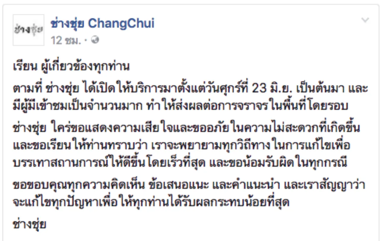 ขณะที่ โครงการช่างชุ่ย ได้โพสต์เฟซบุ๊กขอโทษประชาชนที่สัญจรบริเวณนั้นด้วยว่า "เรียน ผู้เกี่ยวข้องทุกท่าน ตามที่ ช่างชุ่ย ได้เปิดให้บริการมาตั้งแต่วันศุกร์ที่ 23 มิ.ย. เป็นต้นมา และมีผู้มีเข้าชมเป็นจำนวนมาก ทำให้ส่งผลต่อการจราจรในพื้นที่โดยรอบ ช่างชุ่ย ใคร่ขอแสดงความเสียใจและขออภัยในความไม่สะดวกที่เกิดขึ้น และขอเรียนให้ท่านทราบว่า เราจะพยายามทุกวิถีทางในการแก้ไขเพื่อบรรเทาสถานการณ์ให้ดีขึ้นโดยเร็วที่สุด และขอน้อมรับผิดในทุกกรณี ขอขอบคุณทุกความคิดเห็น ข้อเสนอแนะ และคำแนะนำ และเราสัญญาว่าจะแก้ไขทุกปัญหาเพื่อให้ทุกท่านได้รับผลกระทบน้อยที่สุด ... ช่างชุ่ย"