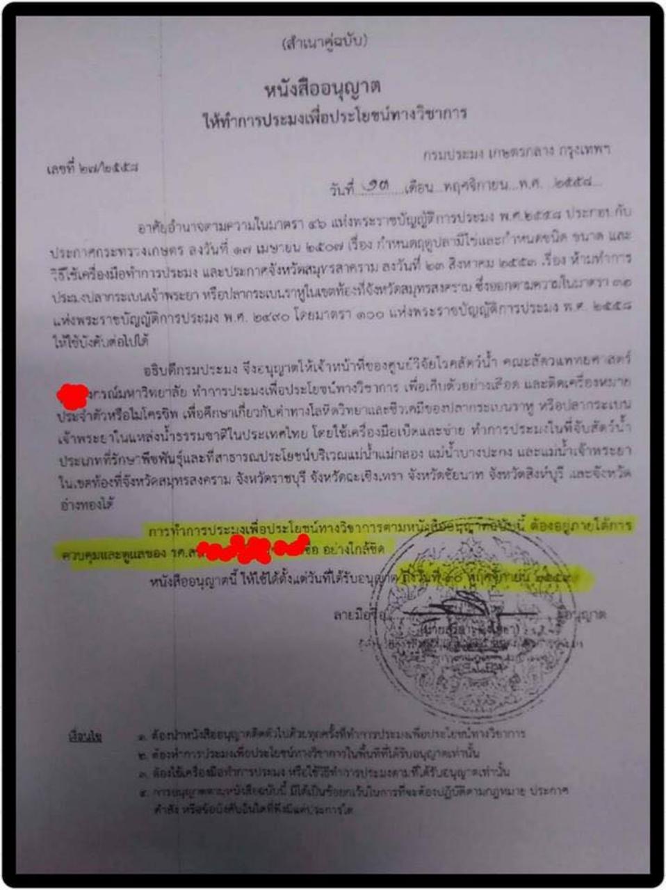 ทั้งนี้ รศ.สพญ.นันทริกา กล่าวต่อว่า เอกสารขออนุญาตขอทำการประมงเพื่อประโยชน์ทางวิชาการที่มีการเผยแพร่บนโลกโซเชียลนั้น เป็นงานวิจัยที่เสร็จสิ้นไปเรียบร้อยแล้ว คาดว่าอาจจะมีคนใช้เป็นข้ออ้างจากการที่ให้ตัวอย่างแก่ศูนย์วิจัยโรคสัตว์น้ำ จึงทำให้เป็นเหตุผลในการไปจับปลามากกว่า