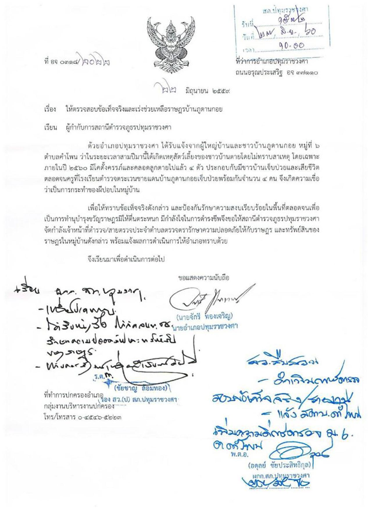 ล่าสุด ทีมข่าวไทยรัฐออนไลน์ ได้ติดต่อไปยัง นายจักรี ทองเจริญ นายอำเภอปทุมราชวงศา เพื่อซักถามถึงที่มาที่ไปของหนังสือราชการฉบับดังกล่าว ซึ่งได้ความว่า ตนเป็นผู้ออกหนังสือฉบับดังกล่าวจริง แต่ลง พ.ศ.ผิด ซึ่งที่มาที่ไปของการออกหนังสือครั้งนี้ ก็คือ หมู่บ้านภูดานกอยมีการทำพิธีจับผีปอบ โดยมีพระภิกษุมาทำพิธี ตนจึงสั่งการให้ปลัดอาวุโสลงพื้นที่ไปตรวจดูความเรียบร้อย เนื่องจากเกรงว่าจะมีการหลอกลวงชาวบ้าน