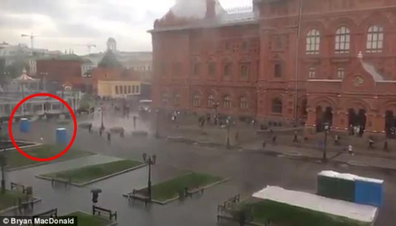 สำนักข่าวต่างประเทศ เผยแพร่คลิปวิดีโอเหตุการณ์ไม่คาดฝันขึ้น ภายหลังจากเกิดเหตุ พายุฝนและลมแรงเข้าถล่มกรุงมอสโก เมืองหลวงของประเทศรัสเซียอย่างหนัก โดยคลิปแรก ถูกโพสต์ลงทวิตเตอร์ โดยนักข่าวที่มีชื่อว่า Bryan MacDonald ซึ่งเป็นภาพของคนคนหนึ่งที่พยายามหนีออกจากสุขาเคลื่อนที่ ซึ่งถูกลมพายุพัดปลิวไปอยู่บริเวณใกล้ๆ กับจตุรัสแดง กรุงมอสโก ท่ามกลางความแตกตื่นของประชาชน