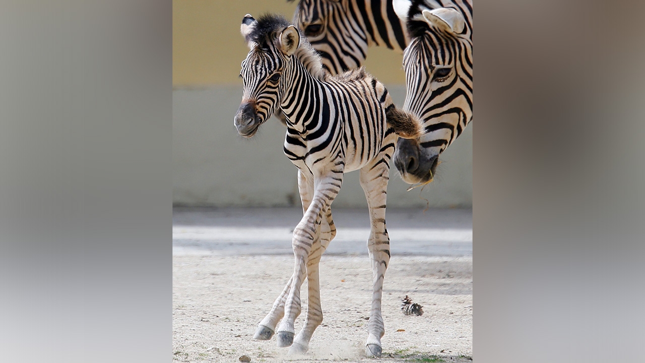 ลูกม้าลายพันธุ์เบอร์เชลล์กำลังลุกหยัดยืนขึ้นขณะที่แม่ม้าลายกำลังมองจากด้านหลัง ซึ่งลูกม้าตัวเล็กเพิ่งเกิดเมื่อปลายเดือนมิถุนายนที่ผ่านมา ในสวนสัตว์เชิร์นบรุนน์ กรุงเวียนนา ประเทศออสเตรีย แต่ยังไม่เปิดเผยเพศของม้าลายเกิดใหม่ตัวนี้ แต่ท่วงท่าดูแข็งแรงและลายสีดำใหญ่พาดสลับกับสีขาวตลอดจนลำตัวทั้ง 2 ข้างก็ชัดเจนสวยงาม ทั้งนี้ ม้าลายเบอร์เชลล์นั้นมีประสาทตาไม่ดี ทว่ามีประสาทหูดีเยี่ยม เป็นสัตว์ใกล้สูญพันธุ์จากการล่าเอาหนังและถูกบุกรุกถิ่นที่อยู่ ปัจจุบันม้าลายชนิดดังกล่าวเหลืออยู่ตามธรรมชาติน้อยลงมาก.