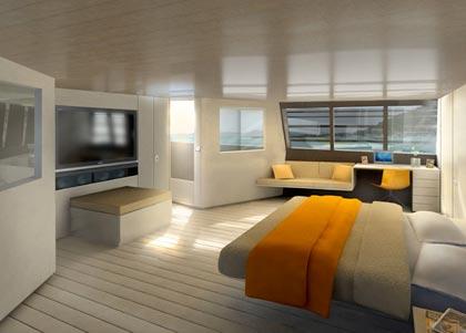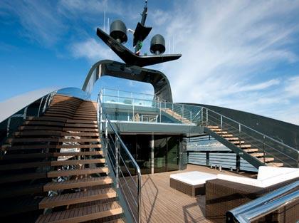 ความ ยาวของลำตัวเรือ132ฟุต โครงของตัวเรือทั้งลำสร้างจากโลหะประเภทสแตนเลสและอลูมินัมอัลลอย ไฟเบอร์กลาสและคาร์บอนไฟเบอร์ กับงานไม้พื้นเรือที่เพียบพร้อมไปด้วยความหรูหราสะดวกสบาย เคบินที่ได้รับการตกแต่งมาอย่างเริ่ดหรูอลังการมีชั้นทั้งหมดถึงสี่ชั้น ตั้งแต่ชั้นดาดฟ้าไปจนถึงชั้นล่างสุดที่ติดตั้งเครื่องยนต์ ห้องรับแขกขนาดยักษ์ บวกด้วยห้องนอนขนาดใหญ่พร้อมห้องน้ำในตัว 2 ห้องและห้องนอนขนาดกลางที่ตกแต่งอย่างดีพร้อมห้องน้ำอีก 3 ห้องสามารถรองรับผู้โดยสารระดับVIP ได้ 12 คน คล้ายโรงแรมลอยน้ำสุดหรูโดยมีห้องพักของลูกเรือทั้ง 7 คนแยกอยู่ในส่วนชั้นสอง และถึงแม้ว่าNorman Foster จะเคยออกแบบอาคารที่ยิ่งใหญ่ซึ่งกลายเป็นสถาปัตยกรรมอันงดงามของโลกแห่งการ รังสรรค์รูปทรง แต่การออกแบบเรือสำราญสุดหรูลำนี้ต้องใช้ประสบการณ์บวกกับแรงบันดาลใจใหม่ๆ ลงสู่นวัตกรรมของการขับเคลื่อนทางน้ำในรูปแบบของอภิมหาเรือยอร์ชสุดหรูลำนี้ การใช้ความคิดเกี่ยวกับการออกแบบกาบระเบียงของตัวเรือกับบันไดทางขึ้น-ลงที่ ใช้แสงสว่างทั้งจากธรรมชาติและแสงไฟจากสปอร์ตไลท์เพื่อเพิ่มมุมมองด้วยการนำ เอาความคิดเดิมหลังจากที่เคยออกแบบโรงแรมและบ้านพักอาศัยของมหาเศรษฐี Fosterจึงเข้าใจในหลักการที่จะทำให้มันออกมาดูดีที่สุดเท่าที่กำลังของสมอง จะสามารถคิดได้ เพื่อเหนี่ยวนำเอาความรู้สึกสะดวกสบายคล้ายกับได้พักอาศัยอยู่ในอาคารที่มี ความมั่นคงในสถานที่ซึ่งแวดล้อมไปด้วยมหาสมุทร