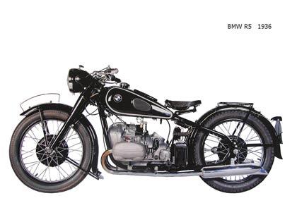 BMW เริ่มต้นปี1935 ด้วยการพัฒนาระบบกันสะเทือนแบบไฮโดรลิคที่ใช้ติดตั้งบนตะเกียบหน้าของจักรยานยนต์ในค่ายของตนเองและได้สร้างชื่อเสียงให้กับBMWเป็นอย่างมากจนประวัติศาสตร์บนหน้าของรถจักรยานยนต์ต้องจารึกเอาไว้ คศ1936 วิศวกรของBMWทำการคิดค้นไฟหน้าแบบใหม่ล่าสุดที่มีลักษณะคล้ายกล่อง ในขณะเดียวกันฝ่ายพัฒนาเครื่องยนต์ได้ทำการปรับปรุงเครื่องยนต์ด้วยการขยายความจุจาก500c.c.สูบนอนมาเป็นเครื่อง750c.c.ที่ให้พละกำลังและแรงบิดสูงขึ้นมาก ตามมาด้วยการเปิดผ้าคลุมรถจักรยานยนต์รุ่นล่าสุด R5 ซึ่งได้กลายเป็นคลื่นลูกใหม่ของวงการรถมอเตอร์ไซค์โลก เฟรมขึ้นรูปทรงรี เครื่องยนต์มีปริมาตรความจุถึง500c.c. บล็อคอลูมินัมอัลลอย ให้กำลังสูงสุด24แรงม้า พร้อมด้วยระบบกันสะเทือนอันลือลั่นที่สามารถปรับตั้งได้ รถจักรยานยนต์BMW R5นับได้ว่าเป็นหนึ่งในนวัตกรรมขั้นสุดยอดของเทคโนโลยีในยุคก่อนสงครามโลกครั้งที่สอง หลังจากนั้นการช่วงชิงความเป็นเจ้าแห่งความเร็วบนอานรถมอเตอร์ไซค์ก็ได้มีโอกาศต้อนรับจักรกลสองล้อตัวแข่งรุ่นล่าสุดของBMW มันใช้เครื่องยนต์สูบนอนติดซุปเปอร์ชาร์จและทำให้ทีมแข่งBMWคว้าชัยชนะอย่างงดงามในการแข่งขันมอเตอร์ไซค์ชิงแชมป์โลกที่ประเทศอังกฤษ โดยทิ้งคู่แข่งที่มีรถแรงๆอย่างราบคาบ