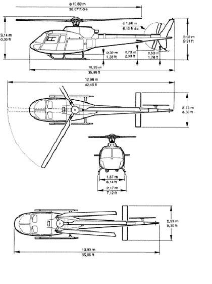 เครื่องยนต์............................(AS350B)-Turbomeca Arriel 1D1 turboshaft driving a three blade main rotor and two blade tail rotor 732 แรงม้า/(AS350D)-Textron (Avco) Lycoming LTS-101-600A2 615แรงม้า /(AS350B3)-Turbomeca Arriel 2B 848แรงม้า