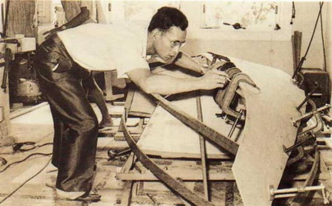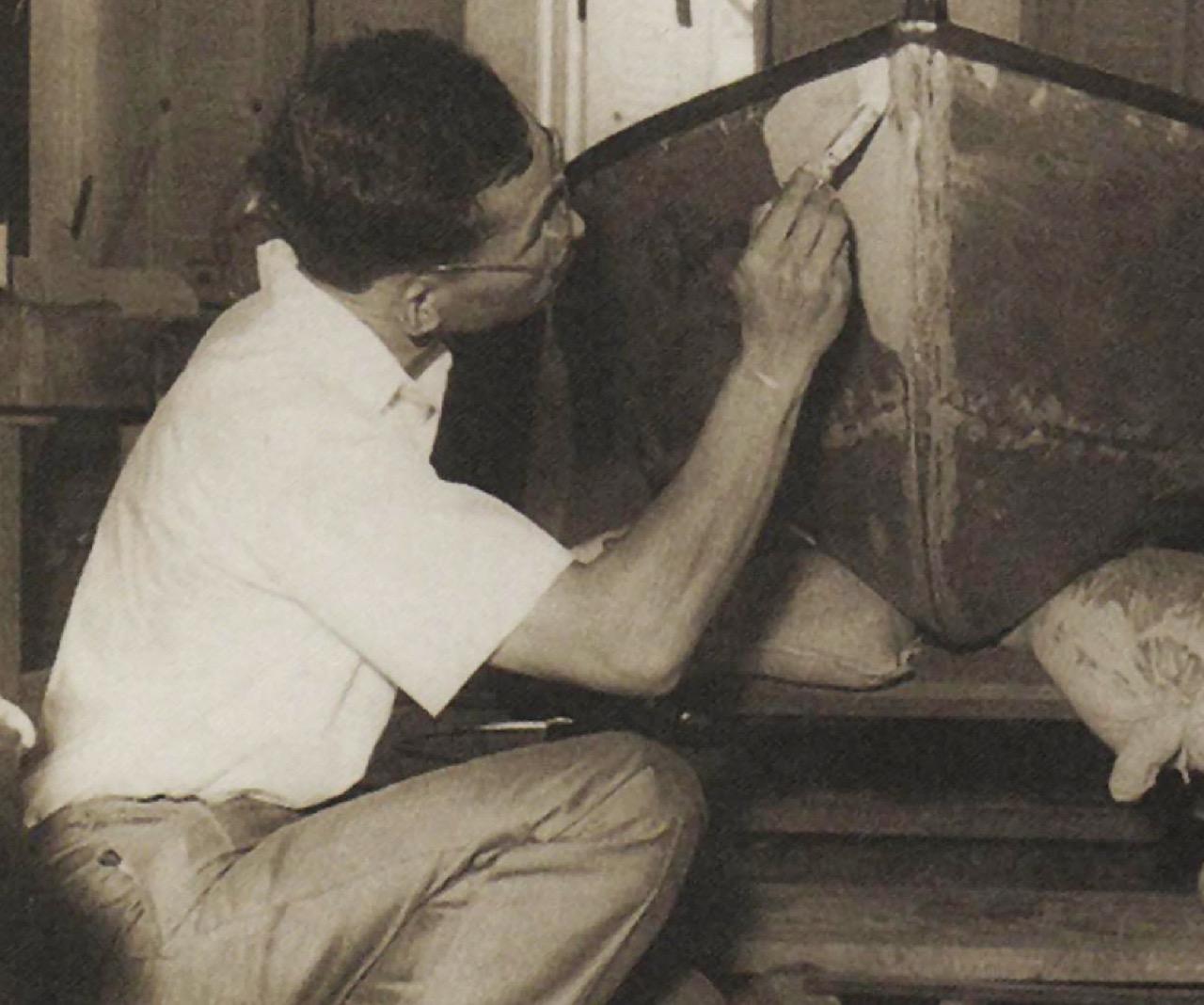 2. ประกอบเปลือกเรือหรือปลาแห้งเข้ากับแผ่นปิดท้ายเรือ ขอบด้านล่างของปลาแห้งผูกติดกันด้วยลวด ตามรูที่เจาะไว้ ปลาแห้งก็จะห่อตัวเป็นรูปตัวเรือ แล้วทากาวหยอดทิ้งไว้กาวจะแห้งและติดแน่น แล้วตัดลวดที่ผูกไว้ชั่วคราวออก เสริมผ้าใยแก้วทับแนวให้แข็งขึ้น ไม่ต้องสร้างกงเรือ วิธีนี้เป็นวิธีใหม่ที่พระองค์ทรงคิดค้นเพื่อให้เรือแข็งแรงและมีน้ำหนักเบา