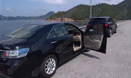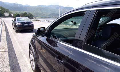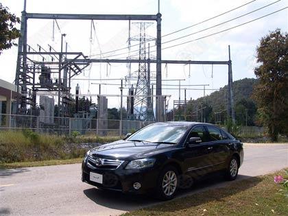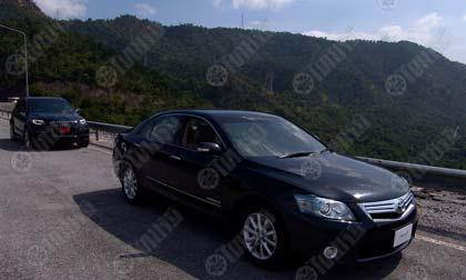 เช้า วันศุกร์ที่ 19 พฤศจิกายนหลังจากติดตั้งระบบ IT เสร็จจึงได้มีโอกาศเอาเจ้า New Camry Hybrid ไปทดสอบสมรรถนะในเรื่องของอัตราเร่ง การทรงตัวในทางโค้งหรือทางขึ้น-ลงเขา อัตราการสิ้นเปลืองเชื้อเพลิงรวมถึงการเบรคแบบมิดๆในขณะที่วิ่งด้วยความเร็ว สูง โดยใช้เส้นทางกาญจนบุรี-เขื่อนศรีนครินทร์-น้ำตกเอราวัณ-เขื่อนท่าทุ่งนา กับเพื่อนร่วมทางร่วมเที่ยวอีกคันในวันนั้นซึ่งเป็นรถ Audi Q7 4.2 TDI Twin-Turbo Quattro S-Line ซึ่งมีกำลังมากถึง 350 แรงม้าบนน้ำหนักตัว 2450 กิโลกรัม กับแรงบิดในระดับนรกแตกที่ 77.5 กิโลกรัม/เมตร ในย่านรอบเครื่องยนต์แค่ 1750 รอบต่อนาที ฉากแห่งการไล่ตามที่ไม่ค่อยจะสมน้ำสมเนื้อก็ปรากฎขึ้นตั้งแต่เริ่มออกเดิน ทาง อาการตึงๆมือของพวงมาลัยเมื่อกระเทือบคันเร่งกันจนมิดเพื่อไล่ตามรถ Q7 ให้ความรู้สึกแปลกๆแต่เรียนรู้ได้ไม่นานนักเกิดจากระบบหน่วงน้ำหนักแปรผันไป ตามความเร็วของระบบพวงมาลัยแบบ EPS -Electric Power Steering เมื่อผ่านเขาชนไก่เส้นทางจะเริ่มขึ้นเนินเล็กๆยาวๆไปจนใกล้สันเขื่อนศรีฯทาง เริ่มลาดชันขึ้นบ้างแต่ยังไม่มาก อย่างที่เคยบอกว่าเกียร์แบบ ECVT- Electrically-Controlled Continuously Variable Transmission ตัดต่อเนียนเกินเหตุจึงทำให้มีความรู้สึกเหมือนกับว่า กำลังควบรถพลังงานไฟฟ้าเต็มรูปแบบจากความเงียบของห้องโดยสารในรถยนต์ยุคใหม่ ของค่าย Toyota ที่ใช้วัสดุในการซับเสียงดีขึ้นกว่าแต่ก่อนมาก ไม่เว้นแม้แต่โพรงซุ้มล้อ ยางขอบประตูไปยันผ้าหุ้มหลังคากับแผงประตู เมื่อขับไปในเส้นทางคดเคี้ยวที่เป็นทางขึ้น-ลงเขา เนินยาวๆที่แซงไม่ได้ รวมถึงมีรถจักรยานยนต์ของชาวบ้านบริเวณไหล่ทางด้านซ้ายกับโค้งตาบอดบนไหล่ เขาทำให้กำลัง 350 ม้าของเจ้า Q7 ไม่สามารถทำอะไรเจ้า New Camry Hybrid ได้มากนัก มีเพียงระบบขับเคลื่อน 4 ล้อแบบ Quattro เท่านั้นที่เหนือกว่าและสำแดงเดชออกมาในบางโค้งที่เจ้า New Camry Hybrid ซึ่งเป็นรถขับเคลื่อนล้อหน้า ต้องขับเข้า-ออกโค้งอย่างระมัดระวังและใช้ความเร็วได้ช้ากว่า เพียง 40 นาทีจากตัวเมืองกาญจนบุรีรถทั้งสองคันก็ขึ้นไปจอดเต๊ะท่าถ่ายรูปอยู่บนสัน เขื่อนศรีนครินทร์ท่ามกลางแสงแดดในช่วงสายที่เริ่มจะร้อนขึ้นเรื่อยๆ
