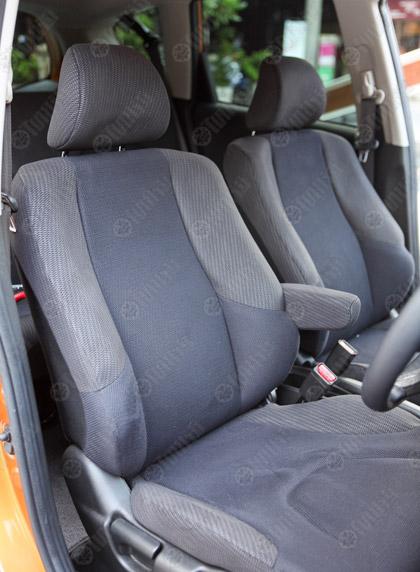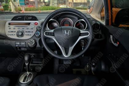 ภายในห้องโดยสารมีการปรับเปลี่ยนรูปแบบของตัวเบาะนั่งโดยใช้โทนสีเข้มอย่างสีนำ้เงิน กับผ้าลายตาข่ายแนวซิ่ง เบาะคนขับยังมีพนักท้าวแขนช่วยลดความเมื่อยล้ายามเดินทางไกล เบาะนั่งสบายแต่ติอยู่นิดเดียวตรงการวางตำแหน่งของตัวเบาะที่ค่อนข้างสูง ซึ่งทั้งผมและคุณอมรชอบเบาะที่สามารถปรับตำแหน่งการนั่งขับให้จมลึกลงไปเพื่อลดแรงเหวี่ยงในขณะที่ขับเข้าโค้งด้วยความเร็วสูงมากกว่า แต่การออกแบบตัวเบาะในลักษณะดังกล่าวกลับมีความเหมาะสมมากสำหรับผู้หญิงตัวเล็กๆที่สามารถเพิ่มทัศนวิสัยในการมองเห็นรอบตัวรถ วงพวงมาลัยสามก้านแนว Honda ปรับตำแหน่งได้ 4 ทิศทาง ติดตั้งสวิชท์มัลติฟังก์ชั่นปรับเครื่องเสียงมาให้ ซึ่ง Honda ใช้ลักษณะเดียวกันนี้แทบจะทุกรุ่น วงพวงมาลัยของเจ้า Jazz มีขนาดกำลังดี ไม่เล็กหรือใหญ่จนเกินไป จับได้ถนัดมือและเหมาะกับการสาวอย่างรวดเร็วเพื่อเปลี่ยนทิศทาง รถ Jazz รุ่นล่าสุดยังมีแป้นเปลี่ยนตำแหน่งเกียร์ติดอยู่หลังวงพวงมาลัยมาให้ใช้งานอีกด้วย