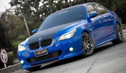 BMW e60 สีฟ้า-ดำคันนี้มีโครงสร้างของตัวถังที่เป็นโลหะ มีทั้งเหล็กและอลูมินัมอัลลอยในบางตำแหน่ง โครงสร้างและส่วนประกอบด้านหน้าผลิตจากอัลลอยทั้งหมด ด้วยกระบวนการผสมผสานวัสดุที่ใช้ทำโครงสร้างแบบหลากหลาย การออกแบบดังกล่าวเพื่อทำให้ด้านหน้าของรถรุ่นนี้มีน้ำหนักเบาขึ้นซึ่งจะส่งผลดีไปยังชุดถ่ายกำลัง มันมีน้ำหนักของตัวถังน้อยกว่ารถ Series 5 e39 รุ่นก่อนหน้าถึง 55 กิโลกรัม แต่ถึงแม้จะเบากว่า มันกลับมีขนาดที่ใหญ่กว่าเจ้า e39 เล็กน้อย รูปทรงด้านข้างแบบแข็งๆตันๆ บวกกับส่วนท้ายที่ดูดีจากมันสมองของ Chris Bangle ปรมาจารย์นักออกแบบ หัวหน้าทีมดีไซน์ของบริษัท BMW (ปัจจุบันลาออกไปทำธุรกิจไวน์ส่วนตัวในสหรัฐอเมริกา) ที่บรรจงสอดแทรกความงามของเส้นคมๆ กับมวลของตัวรถเข้ามาผนวกกันไว้ด้วยความลงตัว มันคือการปฎิวัติการออกแบบด้านหน้าขึ้นใหม่ทั้งหมดและใช้เวลานานพอดูกว่าจะได้รับการยอมรับจากแฟนๆ ของ BMW