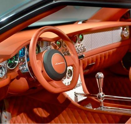 ภายในที่เต็มไปด้วยชิ้นงานอลูมิเนียมกลึงกับสแตนเลสเงาวาวมีอยู่ทั่วไปหมดภายในห้องโดยสารที่มีความพิเศษของรถคันนี้ ปุ่ม สวิชท์ต่างๆมีราคาสูงมากจากการผลิตในลักษณะย้อนยุค ให้ความงามบนความคลาสสิกแบบไม่เหมือนใคร มันคือภายในของรถยนต์ที่ต้องการความแตกต่างอย่างสุดขั้ว ด้วยงานประกอบที่เลอเลิศ เพียบพร้อมไปด้วยตำแหน่งที่มองได้นานไม่มีเบื่อ เหมือนกับนาฬิกาโครโนมิเตอร์ชั้นดีของสวิตเซอร์แลนด์ คันเกียร์เปลือยเปล่าที่มีก้านสีเงินยาวพุ่งออกมาจากกลางคอนโซลคล้ายกับคันบังคับของเครื่องบินโบราณ เบาะตัดเย็บด้วยความปราณีตและบุด้วยชิ้นงานที่คล้ายกับโซฟาหรูๆ ภายในของเจ้า Spyker C8 Aileron มีสีให้ลูกค้าผู้ชอบความแตกต่างเลือกทั้งสีดำ แดง ส้ม น้ำตาล เทา แล้วแต่ความชอบส่วนตัว จอแสดงผล LCD ไม่มีมาให้เพื่อเน้นบรรยากาศคลาสสิกแต่มีจอเล็กๆ กลางหน้าปัดวัดรอบกับความเร็วคอยแจ้งเตือนระบบต่างๆในการใช้งานหรือการปรับเปลี่ยนโหมด หน้าปัดพื้นขาวมีสีเขียวอ่อนๆเมื่อเปิดไฟขับตอนกลางคืน พวงมาลัยหุ้มหนังมีแป้นเปลี่ยนตำแหน่งเกียร์ทำจากอัลลอยอยู่ด้านหลัง คอนโซลของมันก็ยังทำจากอัลลอยกลึงเป็นลายก้นหอยอย่างสวยงาม ชุดคอนโซลของมันมีมูลค่าถึง 3250 ปอนด์และทำออกมาได้แหวกแนวสุดๆ