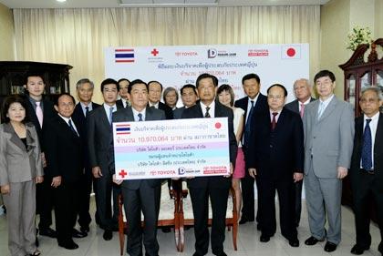มร.เคียวอิจิ ทานาดะ กรรมการผู้จัดการใหญ่ Toyota Motor Thailand Co,ltd ร่วมด้วย นายธนกรศรีจอมขวัญ ประธานชมรมผู้แทนจำหน่ายรถยนต์ Toyota มร.เฮนรี่ โทเลนทิโน่ กรรมการผู้จัดการใหญ่บริษัท Toyota Leasing Thailand Co,ltd เป็นตัวแทนมอบเงินจำนวนทั้งสิ้นกว่า 10 ล้านบาท จากการร่วมกันบริจาคของพนักงานในเครือข่ายธุรกิจบริษัท Toyota รวมทั้งผู้แทนจำหน่าย Toyota เพื่อช่วยเหลือผู้ประสบภัยธรณีพิบัติ ในประเทศญี่ปุ่นผ่านสภากาชาดไทย โดยมี นายสวนิต คงสิริ ผู้ช่วยเลขาธิการฯ ฝ่ายวิเทศสัมพันธ์เป็นผู้รับมอบ เมื่อวันที่ 8 เมษายน ศกนี้ ณ ห้องรับรอง อาคารเทิดพระเกียรติฯ