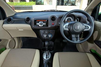 ภายในห้องโดยสารของ Brio ถูกออกแบบให้มีพื้นที่ใช้สอยที่พอเพียง ถึงแม้รูปทรงภายนอกจะมีขนาดเล็ก ด้วยการขยายความสูงของหลังคาและพื้นที่ส่วนท้ายสำหรับเก็บสัมภาระ ตำแหน่งของการขับขี่คือจุดศูนย์กลางของการใช้อุปกรณ์ เช่น ปุ่มปรับอุณหภูมิ และชุดเครื่องเสียง มาตรวัดแบบ 3 วง มีดีไซน์ที่มองเห็นได้อย่างชัดเจนถึงแม้จะมีขนาดที่กะทัดรัดก็ตาม มาตรวัดของ Brio ทั้งวัดความเร็วของตัวรถ วัดรอบเครื่องยนต์กับแจ้งตำแหน่งของเกียร์ออโต้ CVT รวมถึงการแจ้งเตือนสถานะการทำงานของระบบต่างๆ ด้วยสัญลักษณ์ไฟเรืองแสง มาตรวัดความเร็วถูกจัดให้อยู่ในตำแหน่งตรงกลางเพื่อให้ผู้ขับขี่มองเห็นได้อย่างชัดเจน ในเวลากลางคืนมาตรวัดดังกล่าวยังให้แสงสีส้มที่ไม่รบกวนสายตา บนมาตรวัดด้านขวาจะมีไฟแสดงผลการขับขี่แบบประหยัดน้ำมัน ซึ่งจะแสดงเป็นไฟสีเขียวทันทีที่เครื่องยนต์กำลังทำงานอยู่ในรอบที่เหมาะสมกับการประหยัดเชื้อเพลิง ส่วนช่องแอร์ทรงกลม 4 ช่องช่วยกระจายลมเย็นไปทั่วทั้งห้องโดยสาร สวิตช์แอร์แบบหมุนมีรูปแบบที่ใช้งานได้ง่าย แม้จะใช้พลาสติกราคาถูก แต่มีการจัดวางที่เหมาะสม ซึ่งเป็นไปตามลักษณะทั่วไปของรถอีโคคาร์