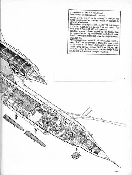 Lockheed SR-71 Blackbird ใช้เครื่องยนต์แฝดของ Pratt And Whitney รุ่น J-58 ติิดตั้งอุปกรณ์ช่วยในการเผาไหม้ให้สมบูรณ์มากขึ้น เครื่องยนต์ Pratt And Whitney J-58 หนึ่งเครื่องให้แรงขับ 32,500 ปอนด์ เมื่อรวมแรงขับของทั้งสองเครื่องจะได้ตัวเลขที่ 65,000 ปอนด์ มีอัตราการไต่ระดับความสูงที่ 1,140 ฟุตต่อนาที พิสัยบินปฏิบัติการณ์ (บินไกล) 4,000 ไมล์ หรือมากกว่านั้นหากเติมเชื้อเพลิงทางอากาศ ความเร็วสูงสุด 3,675 กิโลเมตรต่อชั่วโมง เพดานบินสูงสุด 85,131 ถึง 100,000 ฟุต น้ำหนักรวมทั้งเครื่อง 78 ตันหรือ 78,000 กิโลกรัม ใช้เจ้าหน้าที่ประจำเครื่อง 2 นาย (นักบิน 1 นาย เจ้าหน้าที่ควบคุมระบบเรดาร์ตรวจการณ์และถ่ายภาพ 1 นาย) ความยาวปีก 16.94 เมตร ความยาวรวม 32.74 เมตร สูง 5.64 เมตร Lockheed SR-71 Blackbird ถูกสร้างขึ้นทั้งหมดตั้งแต่ปีคศ 1962 ถึง 1998 รวม 32 ลำ