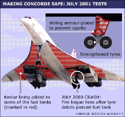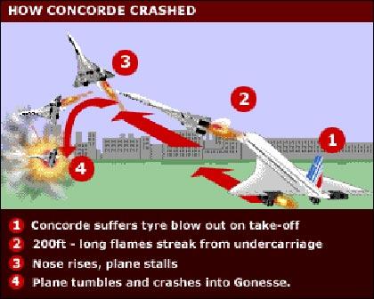 เครื่องยนต์ Rolls-Royce /Snecma Oylmpus 593 หมายเลข1และ 2 สูญเสียกำลังในที่สุดเนื่องจากเพลิงไหม้ เครื่อง Concord เชิดหัวสูงขึ้นและเอียง เนื่องจากแรงขับของเครื่องยนต์ทั้งสี่ไม่สมดุลกัน หลังจากนั้นไม่กี่วินาทีเครื่องยนต์หมายเลข 3-4 ก็มีกำลังลดลงอย่างรวดเร็วจากท่าทางการบินที่ผิดปกติ ทำให้อากาศเข้าสู่เครื่องยนต์น้อยจนเกินไป Concord เลขทะเบียน F-BTSC ตกกระแทกเข้ากับพื้นดินอย่างรุนแรงและชนเข้าไปในอาคารขนาดเล็กที่ใช้เป็น โรงแรม กัปตัน ลูกเรือและผู้โดยสารเสียชีวิตทั้งหมด 109 คน และทำให้มีผู้เสียชีวิตบนพื้นอีก 4 คน จากเหตุการณ์เลวร้ายที่เกิดขึ้นกับเครื่องบิน Concord เพียงลำเดียวจากจำนวนทั้งหมด 20 ลำ (ซึ่งสาเหตุของอุบัติเหตุที่เกิดขึ้นในครั้งนี้ไม่เกี่ยวข้องกับความบกพร่อง ล้มเหลวของระบบ หรือพบว่ามีความผิดพลาดใดๆกับตัวโครงสร้างและเครื่องยนต์ของมันทั้งสิ้น) ประกอบกับตัวเครื่องบินที่เหลืออยู่มีอายุการใช้งานยาวนานกว่า 30 ปี การบูรณะปรับปรุงโครงสร้างของเครื่องที่เหลืออยู่จะต้องใช้งบประมาณมหาศาล และปัญหาราคาน้ำมันเชื้อเพลิงที่พุ่งสูงขึ้นมากทำให้สายการบินจำเป็นต้อง ยุติเส้นทางการบินทั้งหมดและปลดระวางเครื่อง Concord ทั้งหมดลงให้กลายเป็นเพียงตำนานแห่งความเร็วของการเดินทางบนอากาศในยุค Supersonic