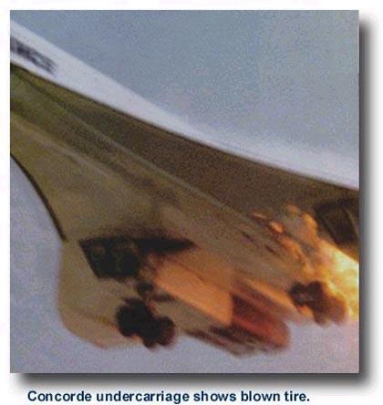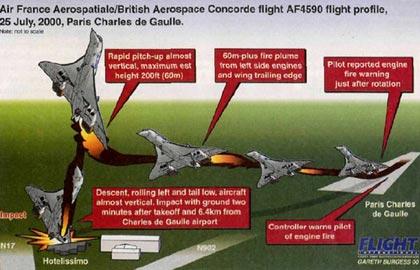 สรุปภาพเหตุการณ์ทั้งหมด-ในช่วงที่กำลังวิ่งขึ้น (เครื่อง Concord ใช้ ความเร็วในการบินขึ้นกว่า 320 กิโลเมตรต่อชั่วโมง) ฐานล้อด้านซ้ายของเครื่องได้วิ่งไปทับเศษอลูมีเนียมความยาวประมาณฟุตเศษที่ หลุดออกจากเครื่อง DC-10 ที่ได้ทำการบินขึ้นไปก่อนหน้านี้ เศษอลูมิเนียมดังกล่าวทำให้ยางของฐานล้อใต้ปีกซ้ายของเครื่อง Concord ระเบิดออกเป็นชิ้นเล็กชิ้นน้อยจากความเร็ว และเศษชิ้นส่วนของยางที่ระเบิดปลิวไปกระแทกเข้ากับปีกซ้ายซึ่งตรงกับตำแหน่ง ของถังเชื้อเพลิงหมายเลข 5 ความรุนแรงของการกระแทกส่งผลให้ถังเชื้อเพลิงแตกและมีเชื้อเพลิงจำนวนมาก รั่วออกมาฟุ้งกระจายและติดไฟ เครื่องยนต์หมายเลข 1 และ 2 ได้รับความร้อนจากเพลิงไหม้จนทำงานผิดปกติทั้งสองเครื่อง เครื่องบิน Concord บินขึ้นทั้งๆที่มีเพลิงลุกไหม้ที่ส่วนท้ายของปีกซ้ายทำให้โครงสร้างในบริเวณ นั้นได้รับความเสียหาย นักบินไม่สามารถทำการเก็บฐานล้อได้เนื่องจากประตูของฐานล้อซ้ายไม่ทำงาน กัปตันคริสติยอง มาร์ตี (christian marty) พยายามบังคับเครื่องเพื่อไปลงที่ท่าอากาศยานเลอบูเก้ซึ่งอยู่ใกล้กับท่า อากาศยานชาร์ลเดอโกมากที่สุด
