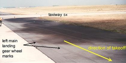 เสียงที่บันทึกได้ใน กล่องบันทึกข้อมูลการบินมีเสียงที่เปลี่ยนไป เป็นเสียงที่ทีมตรวจสอบอุบัติเหตุของ NTSB สามารถประเมินภาพช่วงเวลาของการเกิดอุบัติเหตุบนรันเวย์ในจุดที่พบรอยยาง ล้อหลักหมายเลข 2 ที่ทางวิ่งบนความเร็ว 178 นอตต่อชั่วโมง ตัวเครื่องใช้ทางวิ่งไปแล้วกว่า 1,800 เมตร รวมถึงการพบชิ้นส่วนอลูมิเนียมที่หลุดออกจากชิ้นแฟลบของเครื่อง DC-10 กับชิ้นส่วนเศษถังเชื้อเพลิงหมายเลข 5 รอยคราบเชื้อเพลิงบนทางวิ่งที่ไหม้ไฟในระยะทางประมาณ 2-3 เมตร ในขณะนั้น ตัวเครื่อง Concord ยังคงรักษาแนวทางวิ่งขึ้นได้ใน 1 วินาที ต่อมาเครื่องบันทึกเสียงภายในห้องนักบินมีเสียงซึ่งยังไม่ทราบว่าเป็นเสียง ของอะไรดังขึ้น เครื่องบินมีความเร็วเพิ่มขึ้นเป็น 182 นอตต่อชั่วโมง ใช้ระยะทางวิ่งบนรันเวย์ 26R ไปแล้วกว่า 1885 เมตร นักบินที่ 1 บังคับเครื่องมาทางขวา พร้อมด้วยการดึงหัวเครื่องขึ้น เครื่องยนต์และอัตราเร่งยังคงเป็นปกติทุกอย่าง