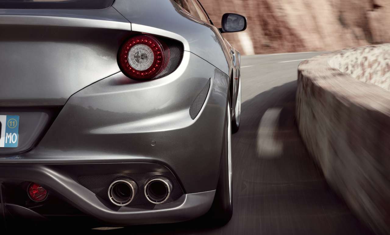 สันหลังคาไล่แนวองศาจากกระจกบานหน้า แล้วค่อยๆ ลาดลงทีละน้อยไปจนถึงเสา C แต่เสาหลังของเจ้า FF ยังคงดูแปลกตาและไม่ค่อยลงตัวเท่าไร บั้นท้ายเรียบ ให้มุมมองที่ธรรมดาเกินไปเมื่อเปรียบเทียบกับตัวรถรุ่นอื่นๆ ของค่ายม้าลำพอง ไฟท้ายทรงกลมแบบ 612 Scaglietti แต่เปลี่ยนเลนส์พลาสติกภายในใหม่ใช้หลอด LED พร้อมท่อระบายไอเสียฝั่งละสองท่อ กับครีบรีดอากาศใต้แผงสปอยเลอร์หลัง นี่คือผลงานขั้นประติมากรรมบนงานศิลปะของพวกอิตาเลียน สง่างาม ทรงพลัง และดิบเถื่อนในทุกมุมมอง มันมีความแปลกแยกทางรูปทรงกว่า Ferrari ทุกๆ คันที่เคยผลิตออกขาย เนื่องจากเจ้า FF มีประตูถึง 3 บาน หากนับฝาหลังที่เปิดออกได้คล้ายกับรถแฮตช์แบ็ก 3 ประตู แม้กระทั่งรุ่น 599 ก็ยังดูธรรมดาเกินไปหากจอดเปรียบเทียบกันแบบจะๆ
