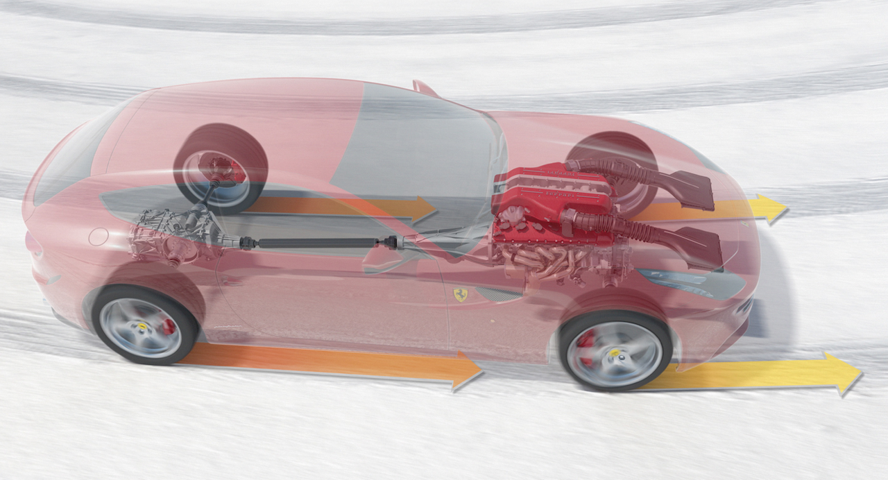 ระบบขับเคลื่อนแบบ 4 ล้อตลอดเวลา กระจายแรงบิดไปที่ล้อคู่หน้า 47% และล้อคู่หลัง 53% ชุดกลไกขับ 4 แบบ AWD ใช้เพลาขับตัวที่ 2 ต่อแยกจากเกียร์มายังเพลาขับหน้า ส่วนเพลาขับหลังยังมีหน้าที่ในการช่วยกระจายน้ำหนักให้มีความสมดุลตลอดเวลาและต่อเนื่อง เมื่อต้องวิ่งลัดเลาะขึ้น-ลงเส้นทางภูเขา ฐานล้อของ Ferrari FF ถูกยืดออกไปอีก 40 มิลลิเมตร จากรุ่น 612 Scaglietti ครึ่งหนึ่งของพื้นที่ 40 มิลลิเมตรถูกใช้เป็นส่วนในการวางเท้าของผู้โดยสารตอนหลังกับการติดตั้งตัวกระจายแรงบิดขับเคลื่อน 4 ล้อที่อยู่ด้านหลัง ระบบส่งกำลังใช้เกียร์ทวินคลัตช์ 7 จังหวะ พร้อมระบบขับเคลื่อน 4 ล้อที่ Ferrari พัฒนาขึ้นใหม่ ภายใต้ชื่อเฉพาะว่า 4RM เบากว่าระบบขับเคลื่อน 4 ล้อทั่วไปประมาณ 50% จากการคัดเลือกวัสดุน้ำหนักเบามาประกอบ