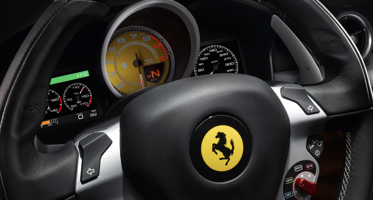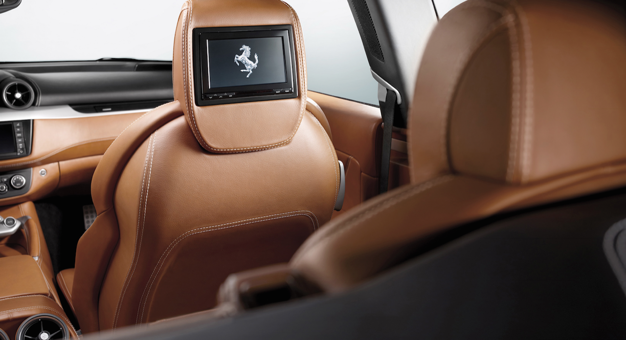 ภายใน Cockpit ของ FF ผสมผสานกันระหว่างภายในของรุ่น 458 Italia และ 599 GTO Fiorano โดยยังคงรูปแบบของแดชบอร์ดและคอนโซลเอาไว้อย่างเหนียวแน่น หนังแท้เนื้อนิ่มมีให้เลือกทั้งแบบโทนสีน้ำตาลหรือดำเดินตะเข็บด้ายด้วยสีแดง ถูกห่อหุ้มไปทั่วบริเวณทั้งตัวเบาะและใต้แผงแดชบอร์ดแบบทูโทน จอมาตรวัดรอบสีเหลืองขนาดใหญ่ มีตัวเลขให้มาถึง 10,000 รอบต่อนาที ส่วนมาตรวัดความเร็วด้านขวามือกับมาตรวัดอุณหภูมิเครื่องยนต์ รวมถึงระดับเชื้อเพลิงมุมซ้ายของหน้าปัดใช้จอ TFT Thin-Film Transistor ที่ให้ความคมชัดสูงในการส่งถ่ายข้อมูลขึ้นไปแสดงผลบนจอภาพ ช่องแอร์ทรงกลมทั้ง 5 ดูขัดแย้งกับทรงของแดชบอร์ด และไม่งดงามลงตัวเท่างานช่องแอร์แบบทรงเหลี่ยมของ 458 Italia จอแสดงผลในระบบให้ความบันเทิงตรงกึ่งกลางมีขนาด 7 นิ้ว พร้อมระบบนำทางและกำหนดพิกัดด้วยดาวเทียม ชุดเครื่องเสียง CD-DVD MP3 โทรศัพท์ Buletooth กับอุปกรณ์ต่อเชื่อมเครื่องเล่นเพลงภายนอก AUX-USB ระบบปรับอุณหภูมิภายในห้องโดยสารแบบดิจิตอลแยกส่วนพร้อมปุ่มปรับโหมดหน้าตาธรรมดา วงพวงมาลัยสามก้านทรงฐานตัด มีก้านเปลี่ยนเกียร์ทำจากอัลลอย สวิตช์มาเนตติโน ตรงฐานของพวงมาลัยกับปุ่มสวิตช์ปรับใบปัดน้ำฝนและสวิตช์ติดเครื่องยนต์รวมอยู่บนฐานพวงมาลัยจากการออกแบบ สวิตช์มาเนตติโนสีแดงยังคงเหมือนกับรถ Ferrari รุ่นอื่นๆ มีโปรแกรมการสั่งงานเพื่อปรับโหมดการขับขี่ได้ถึง 5 ระดับ แป้นคันเร่ง เบรกและแป้นพักเท้าใช้แผ่นอัลลอยเจาะรูทั้ง 3 ชิ้นงาน รวมถึงแผ่นวางเท้าของผู้โดยสารตอนหน้าก็ยังทำมาจากอะลูมินัม